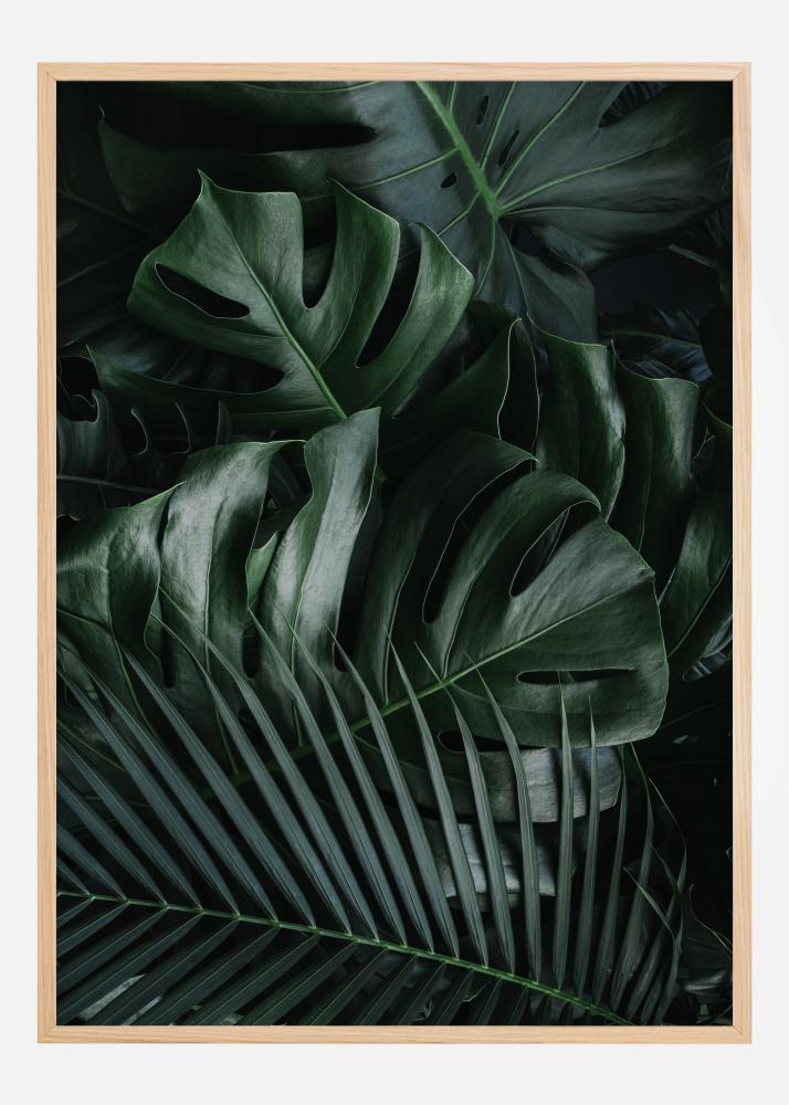 Ένα πορτρέτο με φύλλα πράσινης Monstera και φύλλα φοίνικα. Το φυσικό φως φωτίζει τα πάνω φύλλα της Monstera και δημιουργεί πιο σκούρες αποχρώσεις στο πάνω μέρος της εκτύπωσης. Τα πριονωτά φύλλα δημιουργούν μια ζεστή και χαλαρωτική αίσθηση. Μια τέλεια αφίσα για όσους αγαπούν τα φυτά.