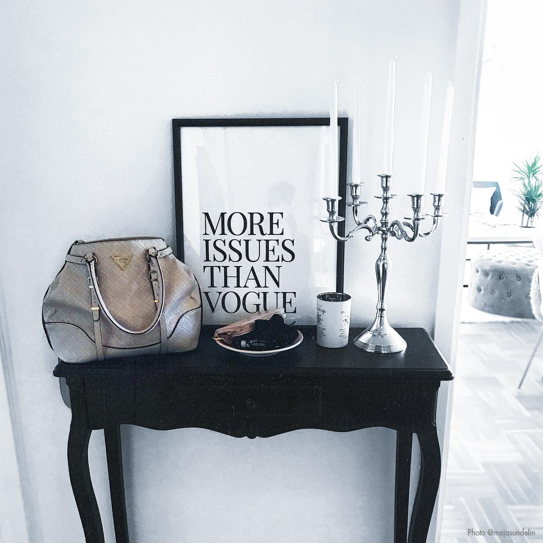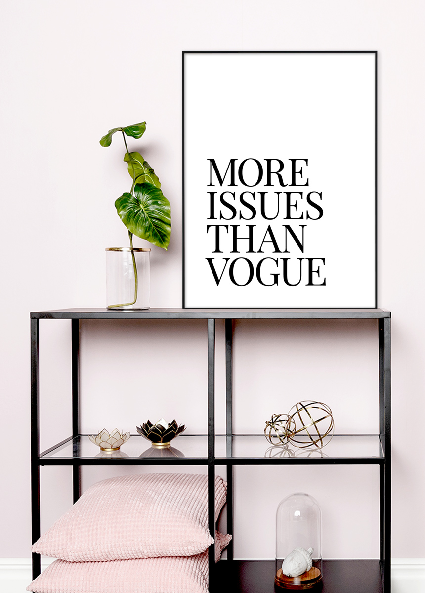 Να είστε τολμηροί με την λάμψη στο μάτι και τοποθετήστε αυτή την κομψή αφίσα στο σπίτι ή στον χώρο εργασίας σας. Η αφίσα είναι λευκή με μαύρο κείμενο που λέει “More Issues Than Vogue”. Ως μια επιπλέον έξυπνη λεπτομέρεια, το κείμενο είναι γραμμένο με μια γραμματοσειρά που θυμίζει εκείνη που χρησιμοποιείται στο λογότυπο του διάσημου περιοδικού μόδας. Συμπληρώστε με μια χρυσόχρωμη κορνίζα για μια πρόσθετη αίσθηση λάμψης! Διατίθεται σε διάφορα μεγέθη, από τα οποία ένα σίγουρα ταιριάζει στον συγκεκριμένο χώρο όπου θέλετε να την τοποθετήσετε.
