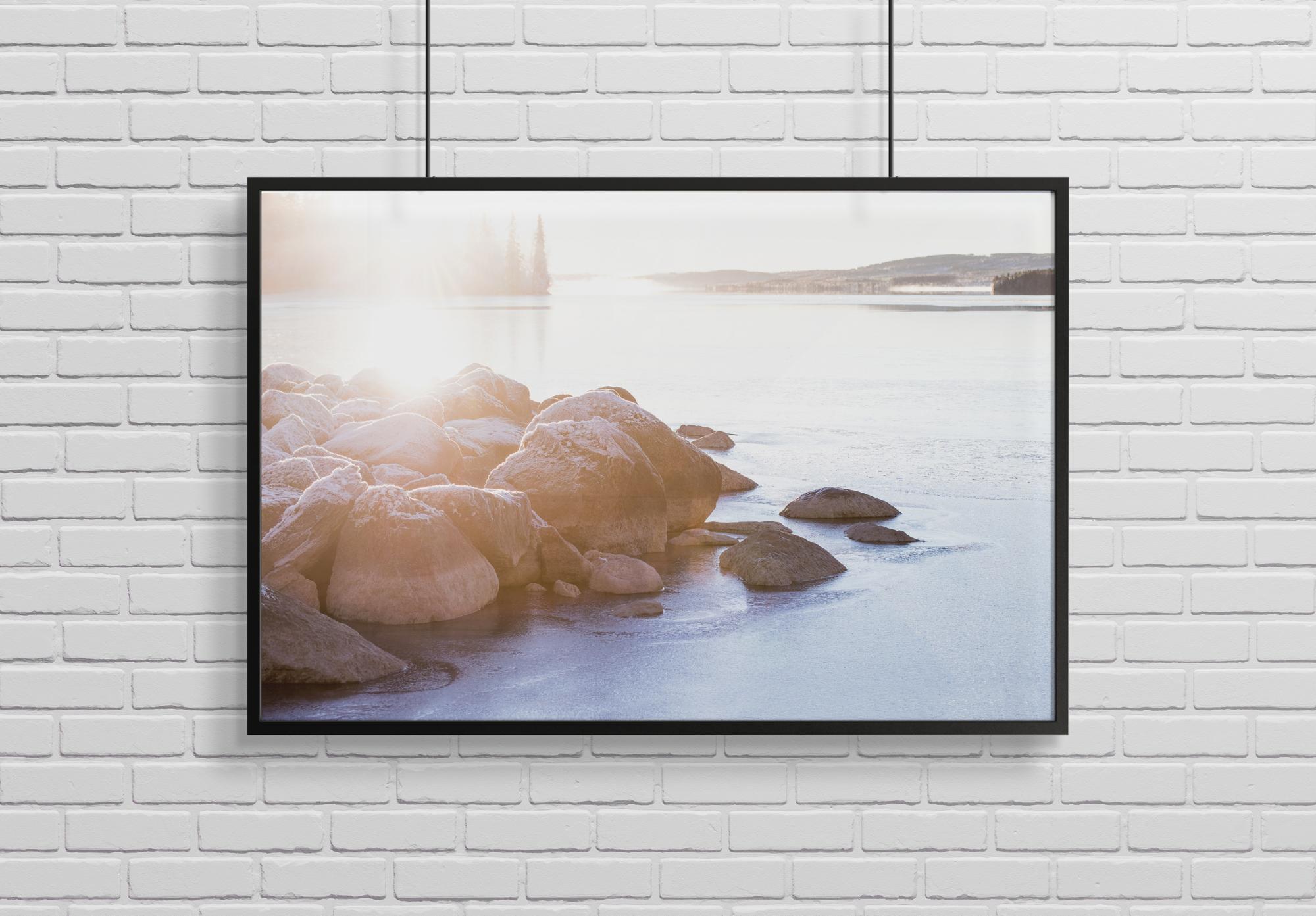 Μια εκθαμβωτική αφίσα τοπίου με βράχια δίπλα στη θάλασσα ένα πρώιμο πρωινό. Το θαλασσινό νερό αντανακλά το ηλιακό φως μέσα από τις καφέ πέτρες και δημιουργεί μια λευκή επιφάνεια. Με την πεδιάδα στο βάθος, αυτή η εκτύπωση θα φωτίσει το σαλόνι σας.