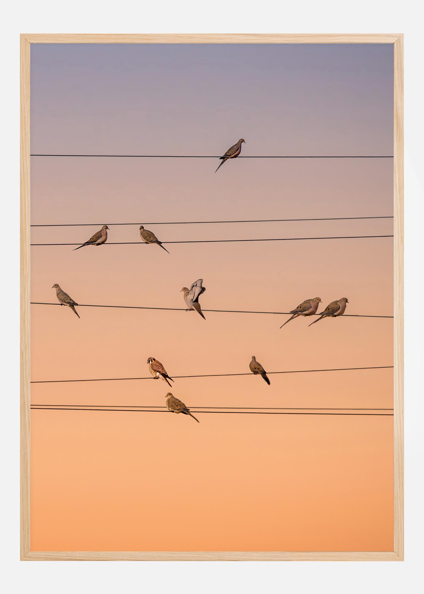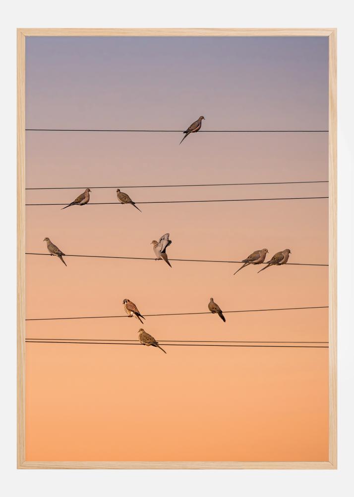 Μια καταπληκτική αφίσα με πουλιά που κάθονται σε ηλεκτροφόρα καλώδια κατά τη διάρκεια ενός πορτοκαλί ηλιοβασιλέματος. Τα πουλιά και οι ηλεκτροφόρες γραμμές θυμίζουν μια παρτιτούρα που θυμίζει το κελάηδισμα των πουλιών. Αυτή η εικόνα ταιριάζει καλά σε κάθε τοίχο καθιστικού.