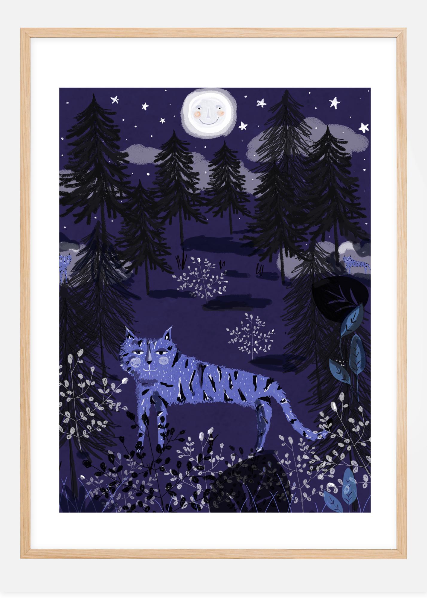 Μια διασκεδαστική αφίσα που δείχνει ένα δάσος τη νύχτα με ένα χαμογελαστό φεγγάρι και μια τίγρη. Ο μοβ ουρανός είναι γεμάτος σύννεφα και λαμπερά αστέρια. Στο παρασκήνιο, τα πεύκα στέκονται ψηλά ενώ το φεγγάρι τα κοιτάζει. Τα σκούρα μοβ και πράσινα χρώματα δημιουργούν μια ζεστή αίσθηση, ενώ οι μικροί λευκοί θάμνοι δίνουν στην εκτύπωση αυτό το λίγο επιπλέον φως. Μια τέλεια εικόνα για το παιδικό δωμάτιο.