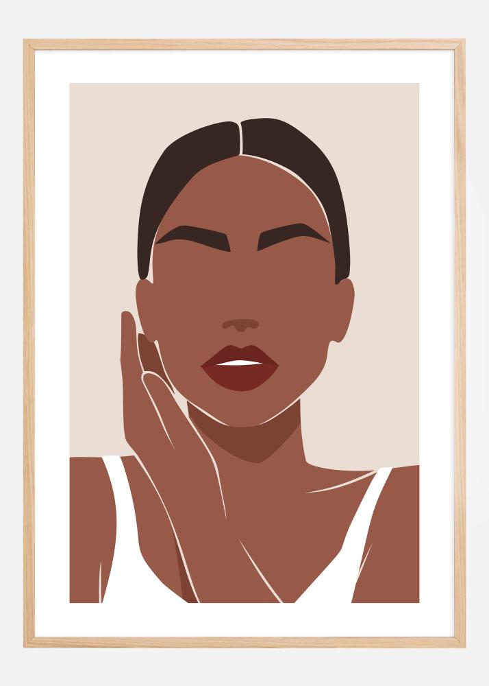 Αυτή η αισθητικά ελκυστική αφίσα απεικονίζει μια γυναικεία σιλουέτα σε στυλιζαρισμένη και απλοποιημένη μορφή. Η εικόνα είναι κατασκευασμένη με περιορισμένο χρωματικό φάσμα που αποτελείται από γήινες αποχρώσεις, από ανοιχτό μπεζ έως πιο βαθύ καφέ, προσδίδοντας μια ζεστή και φιλόξενη αίσθηση. Η στάση της γυναίκας είναι χαλαρή και στοχαστική, προσδίδοντας στο πορτρέτο μια αίσθηση ηρεμίας και αυτοπεποίθησης.