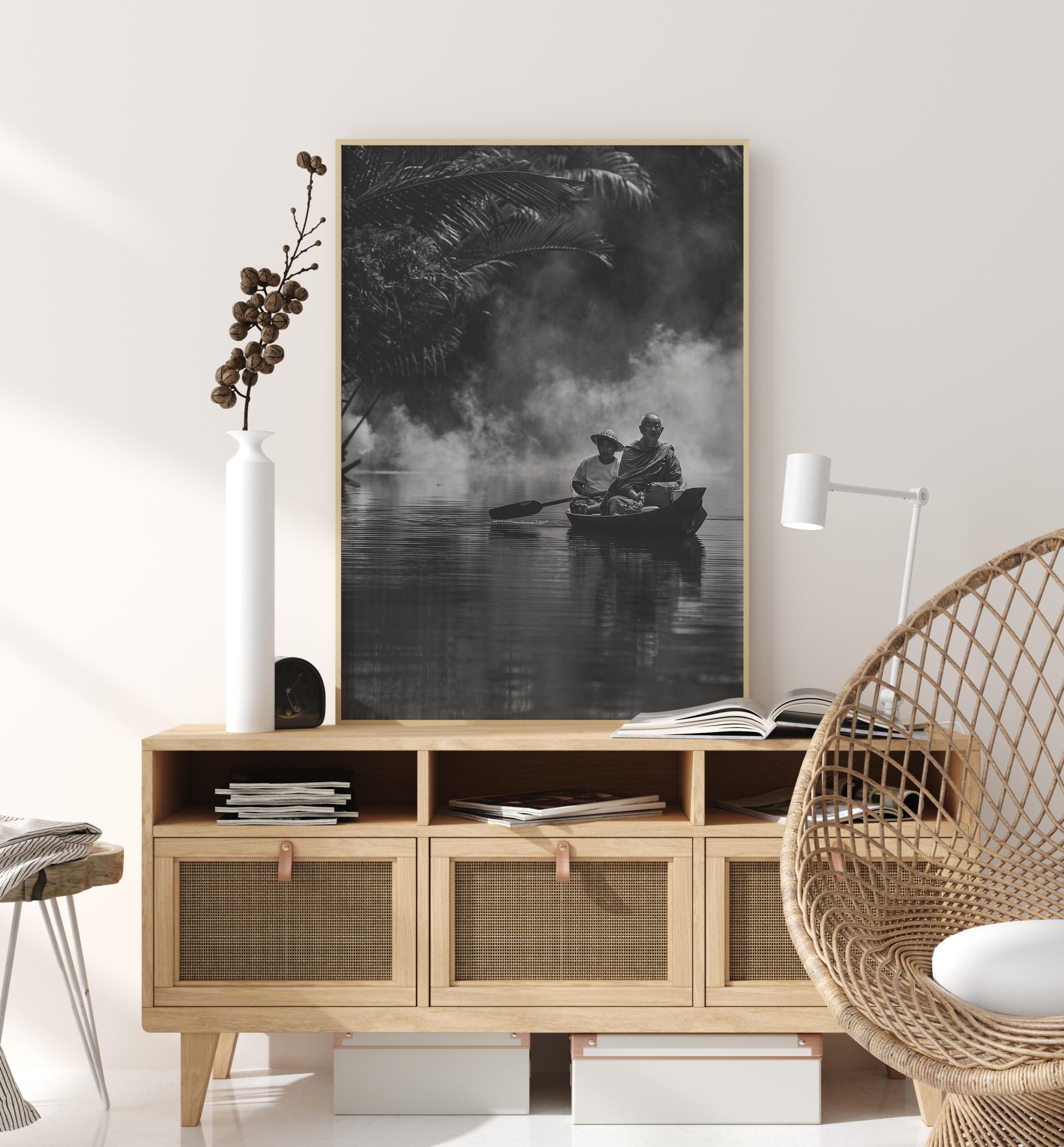 Μια γαλήνια ασπρόμαυρη κοντινή φωτογραφία δύο ανδρών που ταξιδεύουν κατά μήκος ενός ποταμού. Δύο άνδρες κάθονται γαλήνια στη ταϊλανδέζικη γόνδολα αλιευτικό σκάφος τους και φαίνεται να παρατηρούν το περιβάλλον τους. Το φυσικό φως του ήλιου που λάμπει μέσα από τα σύννεφα αντανακλά το σκάφος στο νερό. Μπορεί κανείς σχεδόν να ακούσει τη σιωπή σε αυτή την αφίσα. Ιδανικό για ένα ήρεμο περιβάλλον.