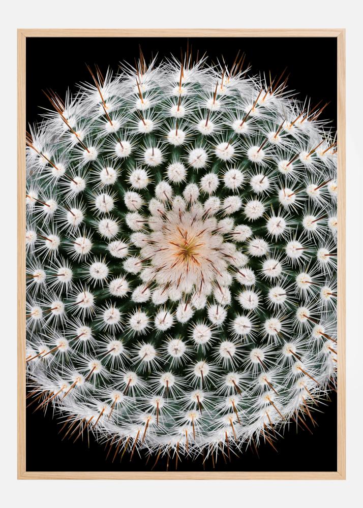 Μια εναέρια φωτογραφία ενός κάκτου με λευκά λουλούδια. Σε μαύρο φόντο, το σκούρο πράσινο χρώμα αναδεικνύει τα λευκά λουλούδια και τα αιχμηρά αγκάθια. Το κεντρικό μέρος του φυτού έχει μια ελαφριά κίτρινη πινελιά, προσφέροντας επιπλέον χρώμα στην εκτύπωση. Μια τέλεια αφίσα για όλους όσοι αγαπούν τα φυτά.
