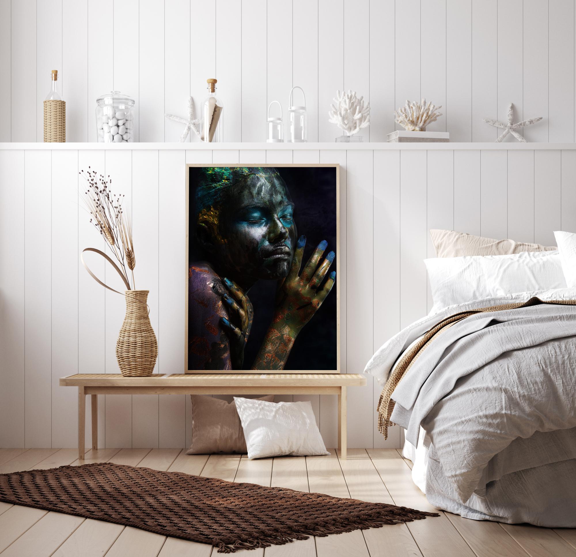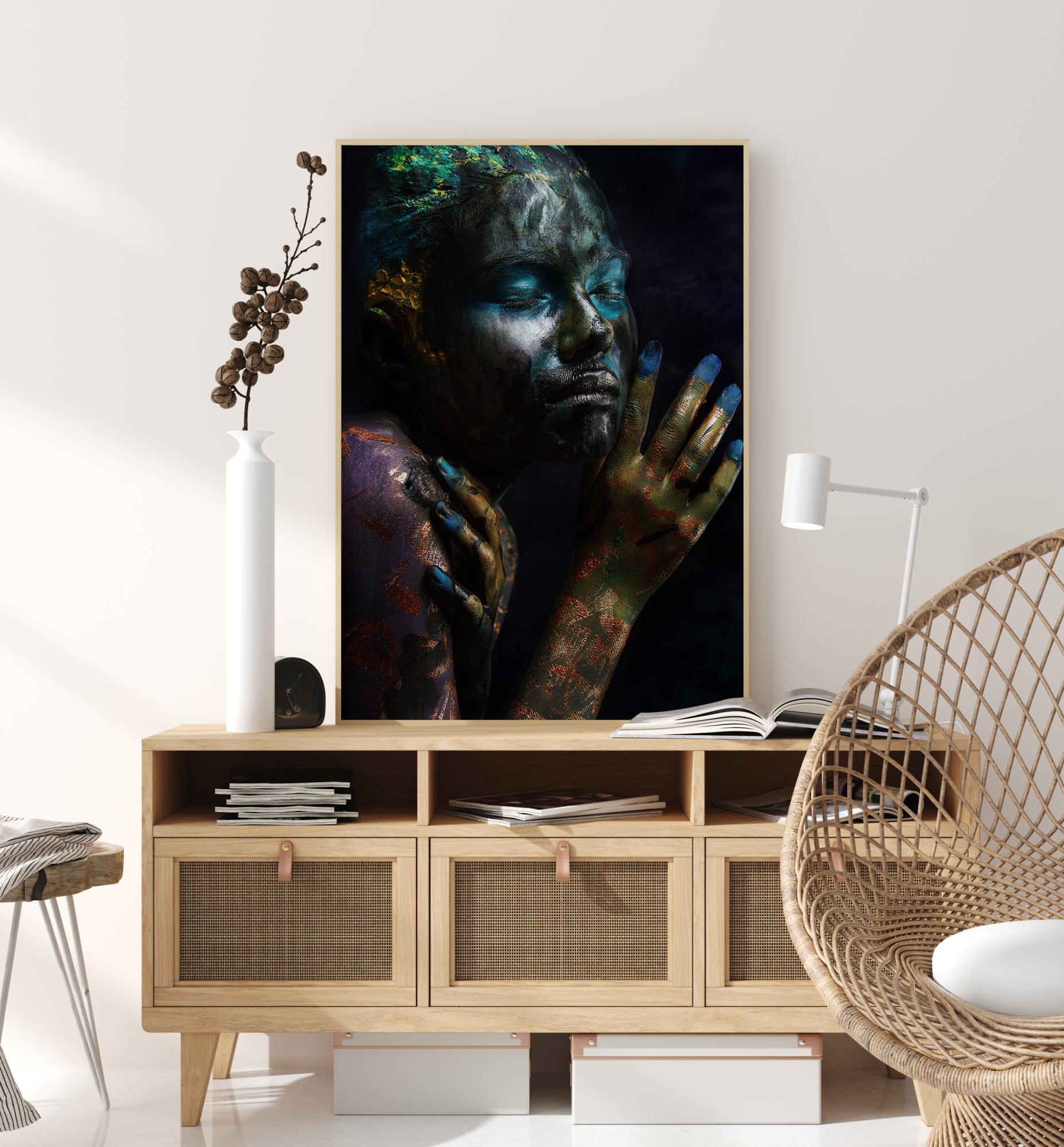 Ένα εκπληκτικό τύπωμα μιας γυναίκας που είναι καλυμμένη με χρώμα. Σε ένα μαύρο φόντο, η γυναίκα είναι καλυμμένη με πολύχρωμα χρώματα. Με το φυσικό φως να λάμπει στο πρόσωπο και τους ώμους της γυναίκας, αναδεικνύεται η ένταση των χρωμάτων. Μία όμορφη αφίσα που μπορεί να προσθέσει χρώμα σε έναν λευκό τοίχο.