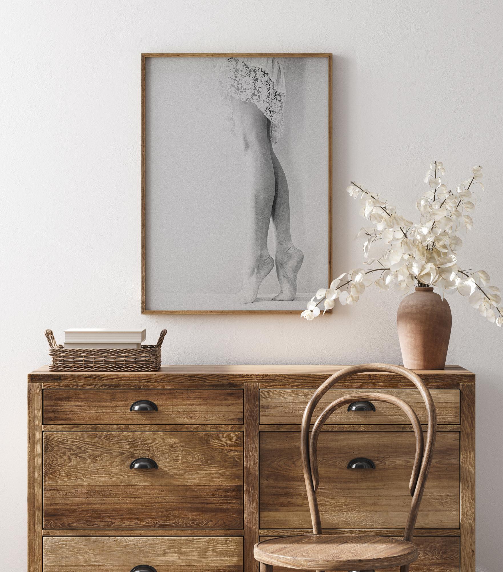 Ένα κομψό ημι-πορτραίτο μιας γυναίκας που στέκεται στα δάχτυλα των ποδιών. Η απλότητα της εικόνας σε συνδυασμό με το λεπτό λευκό κάνει αυτήν την εικόνα μια εξαιρετική προσθήκη στην κρεβατοκάμαρά σας ή στο σαλόνι σας.