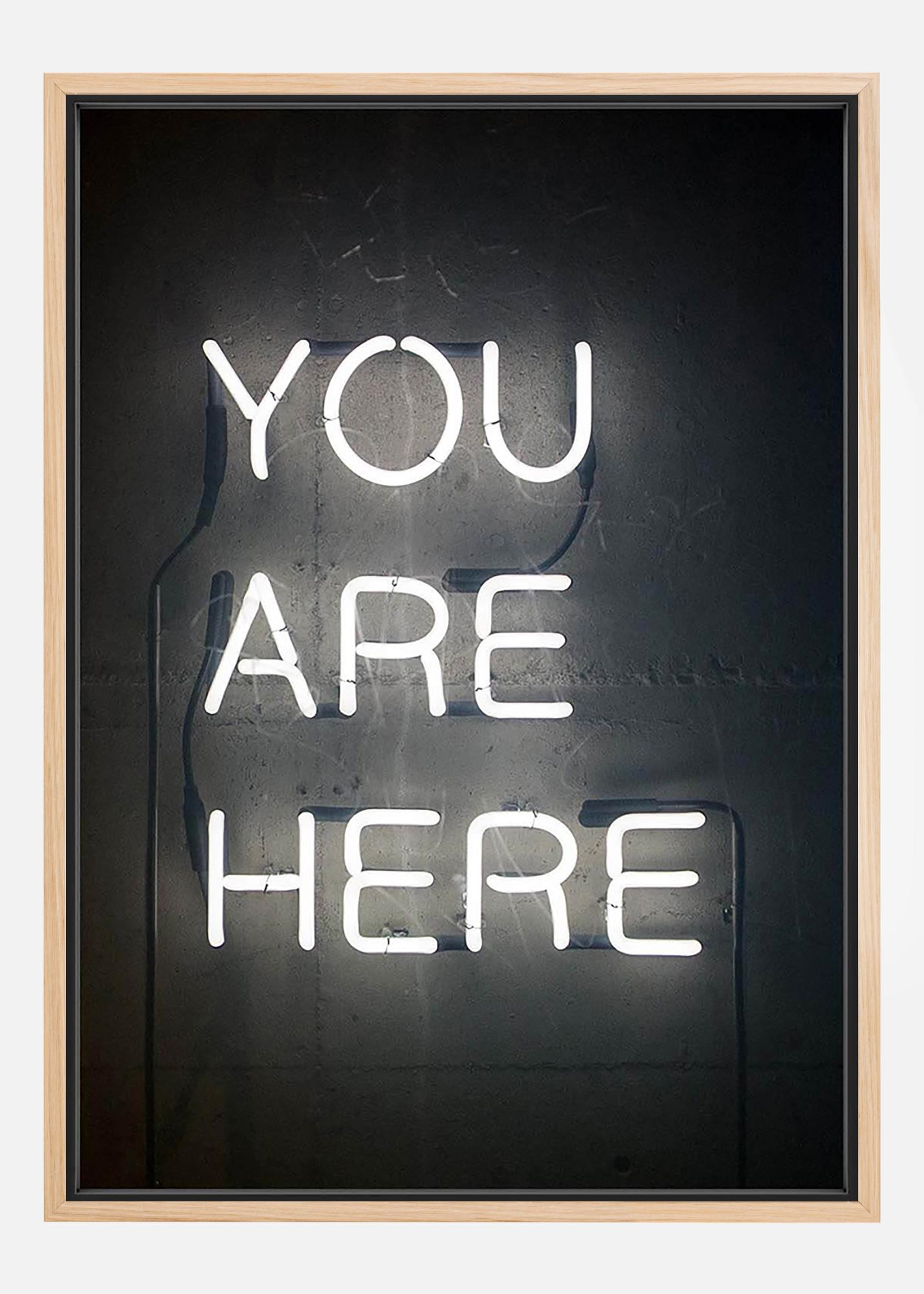 Μια ασπρόμαυρη αφίσα κειμένου ενός νέον σήματος με την ενημερωτική φράση "You are here". Ένας απλός και κομψός πίνακας με ένα ευχάριστο χιουμοριστικό στοιχείο, ιδανικός για συνδυασμό με άλλα από τα φανταστικά μας μοτίβα σε ένα μεγαλύτερο τοίχο με πίνακες.