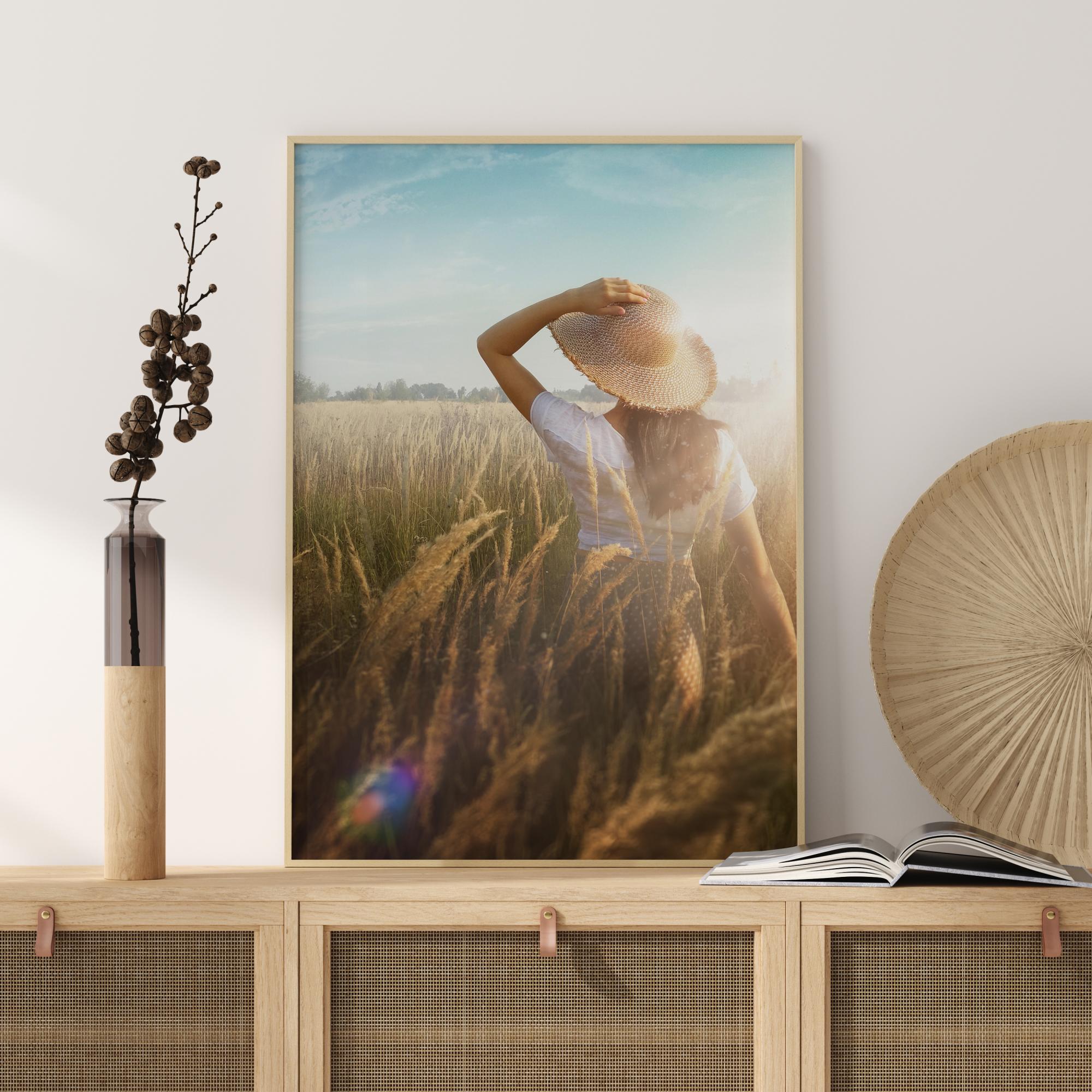 Μια χαλαρωτική και φρέσκια εκτύπωση μιας γυναίκας με ψάθινο καπέλο στα χωράφια με σιτάρι. Ο όμορφος μπλε ουρανός συναντά το χρυσό χωράφι με σιτάρι. Με το χέρι στο κεφάλι της, μια νεαρή γυναίκα περπατάει στα χωράφια και απολαμβάνει τον καθαρό αέρα. Μια τέλεια αφίσα για όλους που εκτιμούν την ομορφιά της φύσης.
