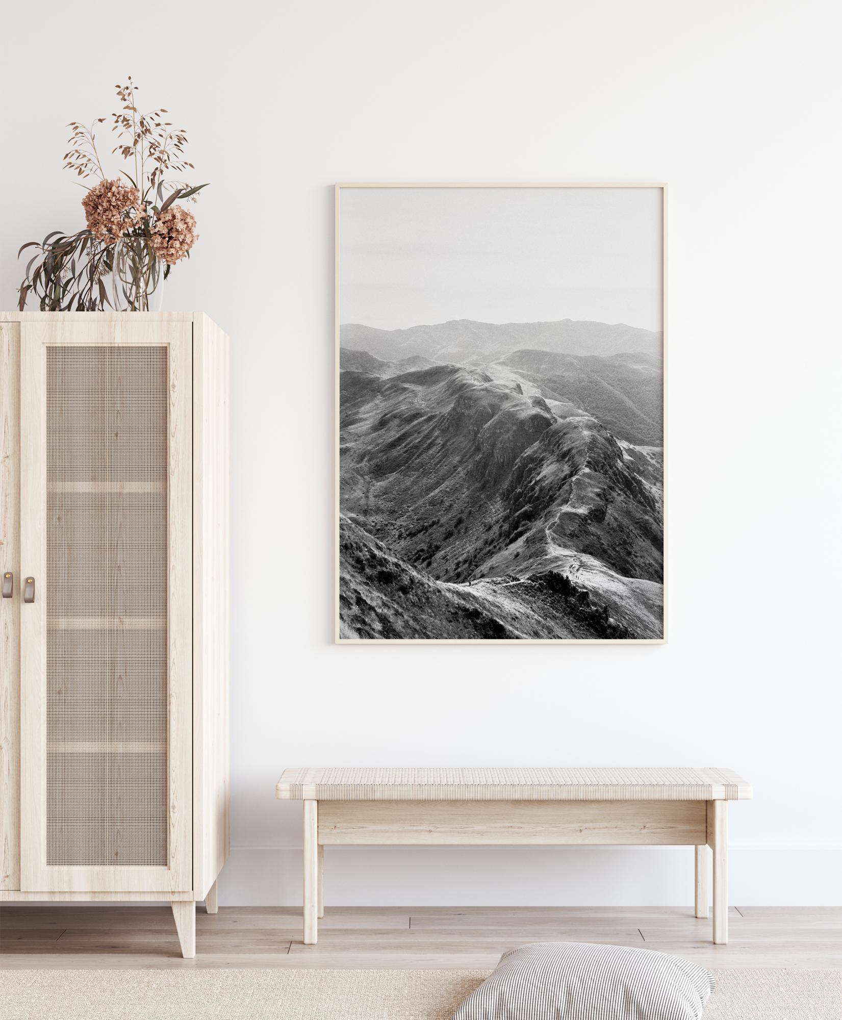 Μια ασπρόμαυρη αφίσα με μια οροσειρά. Οι διάφορες αποχρώσεις του γκρι συγχωνεύονται όλες τέλεια μεταξύ τους. Χωρίς σημάδια βλάστησης ή ζωής, σχεδόν μπορεί κανείς να ακούσει τη σιωπή στις κορυφές των βουνών. Κρεμάστε αυτήν την εκτύπωση σε έναν πολύχρωμο τοίχο και ακούστε τον άνεμο που φυσάει.