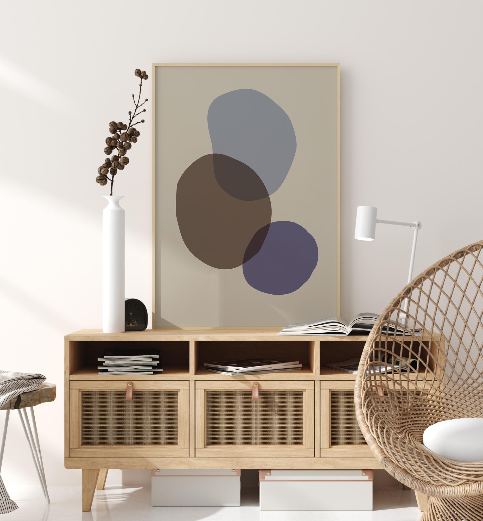Μια ευφάνταστη αφίσα με τρία διαφορετικά χρωματιστά σχήματα. Σε ένα κρεμ φόντο, τα καφέ, γκρι και μοβ σχήματα επικαλύπτονται μεταξύ τους. Το καφέ σχήμα κυριαρχεί στα μικρότερα μοβ και γκρι σχήματα. Ένα απλό εκτύπωμα για να κρεμάσετε στο σπίτι σας. Χρησιμοποιήστε τη φαντασία σας για να δείτε τι απεικονίζουν τα σχήματα.