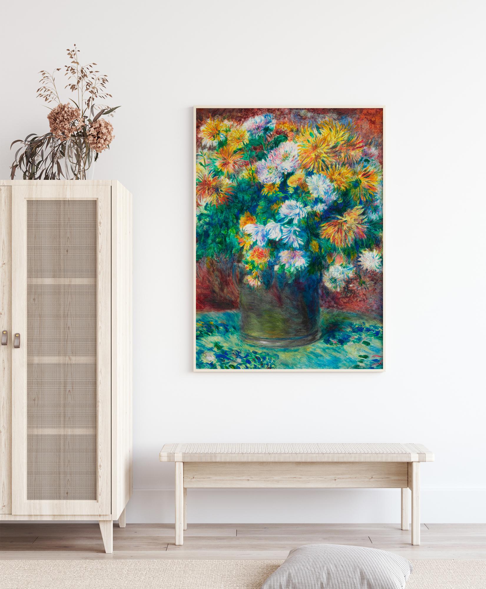 Μια αφίσα με ζωγραφισμένα πολύχρωμα λουλούδια. Σε ένα πολύχρωμο φόντο, αυτή η όμορφη χρωματική κλίμακα δημιουργεί μια ευχάριστη ατμόσφαιρα. Τα λουλούδια είναι τοποθετημένα σε έναν καμβά τυρκουάζ χρώματος που αναδεικνύει όλα τα φωτεινά χρώματα σε αυτήν την εικόνα. Μια τέλεια εκτύπωση για όλους όσους αγαπούν τα λουλούδια.