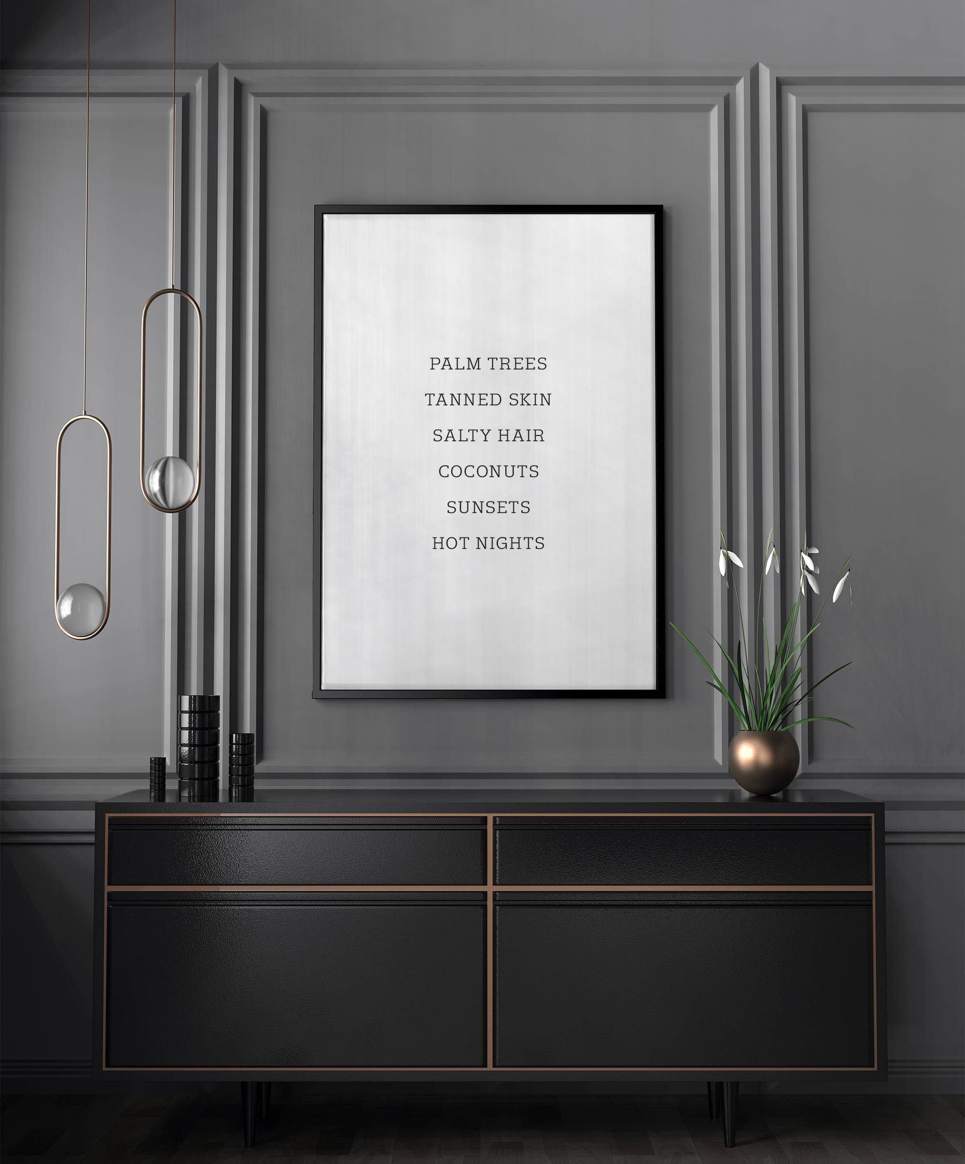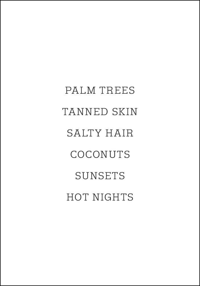 Μια παθητική αφίσα που μεταφέρει ένα μήνυμα με καλοκαιρινή αίσθηση. Με τη μαύρη γραμματοσειρά σε μια λευκή επιφάνεια, εμφανίζονται οι λέξεις: ΦΟΙΝΙΚΕΣ, ΜΑΥΡΙΣΜΕΝΟ ΔΕΡΜΑ, ΑΛΜΥΡΑ ΜΑΛΛΙΑ, ΚΑΡΥΔΕΣ, ΗΛΙΟΒΑΣΙΛΕΜΑΤΑ, ΖΕΣΤΕΣ ΝΥΧΤΕΣ. Οι κεντρικά τοποθετημένες λέξεις μάς θυμίζουν την καλοκαιρινή σεζόν. Προσθέστε μια πινελιά καλοκαιριού στο μοντέρνο σαλόνι σας με αυτό το εκτύπωμα.