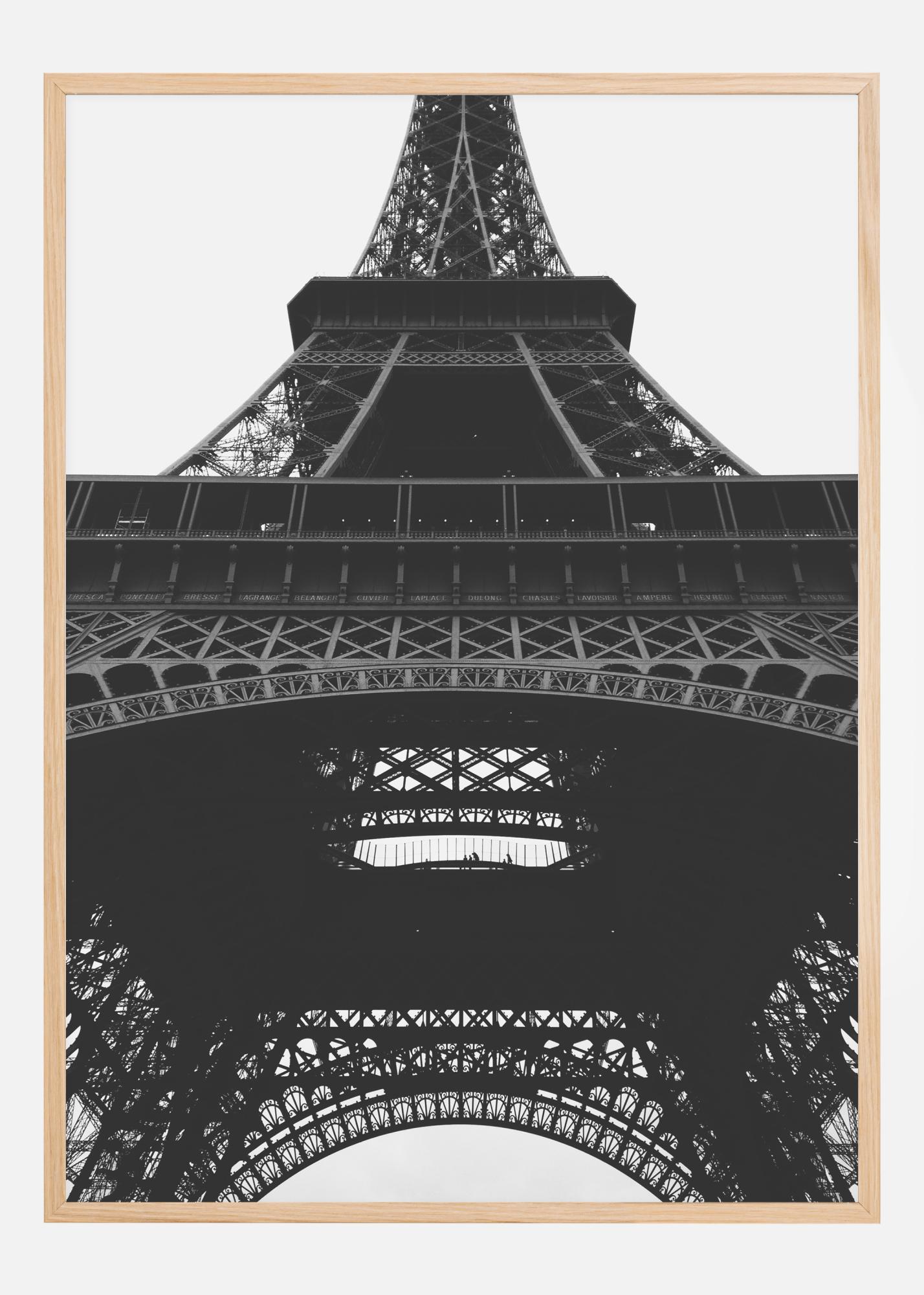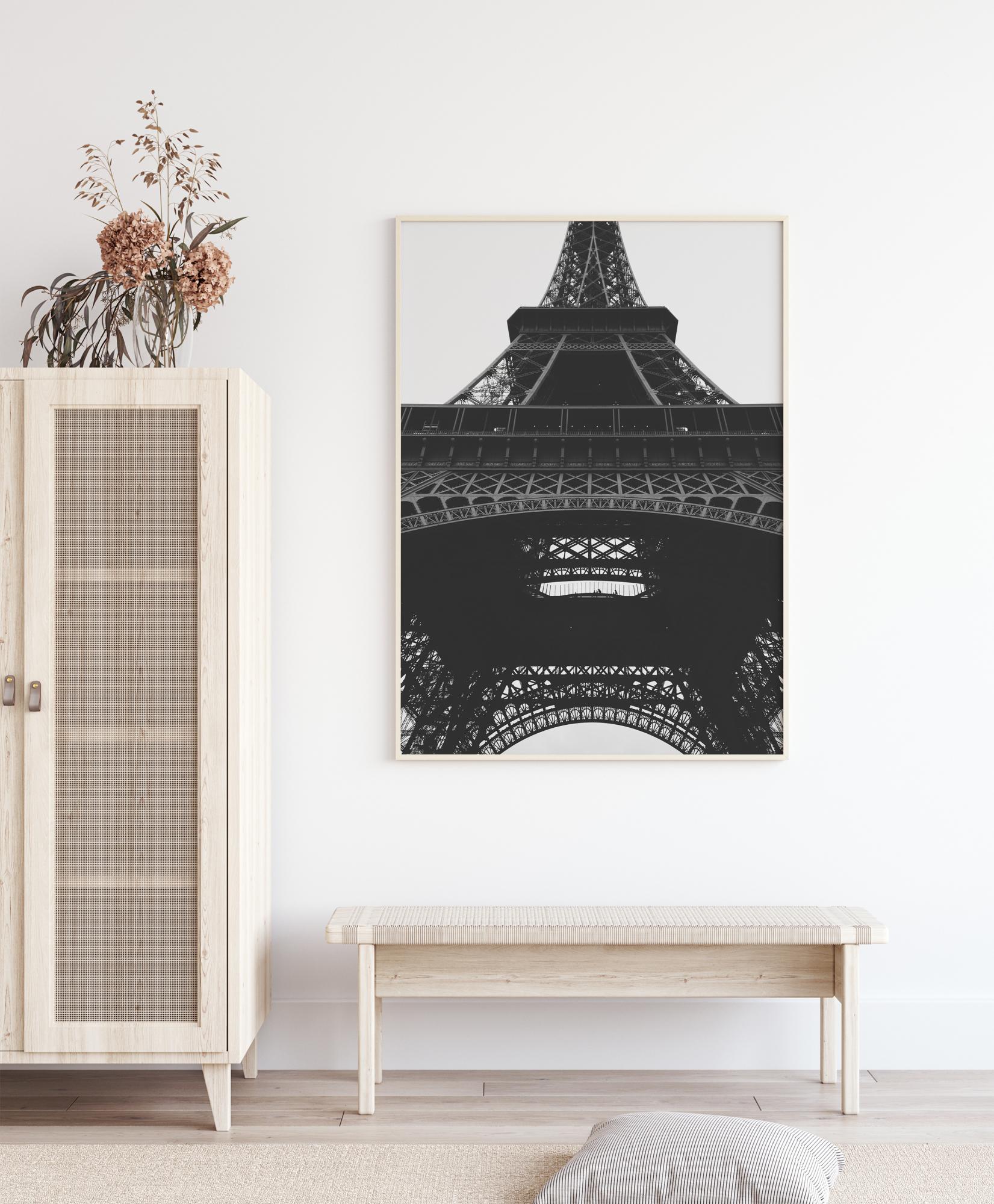 Μία φανταστική ασπρόμαυρη αφίσα με τον Πύργο του Άιφελ. Η εικόνα της μαζικής σιδερένιας κατασκευής είναι τραβηγμένη από χαμηλή οπτική γωνία, κάνοντας τον πύργο να εναρμονίζεται τέλεια με τον γκρι ουρανό. Αυτό το τεχνικό αριστούργημα δημιουργεί μια ελαφριά, ευάερη και ισχυρή δομή. Μία τέλεια εκτύπωση για να κρεμαστεί σε ένα σύγχρονο περιβάλλον.