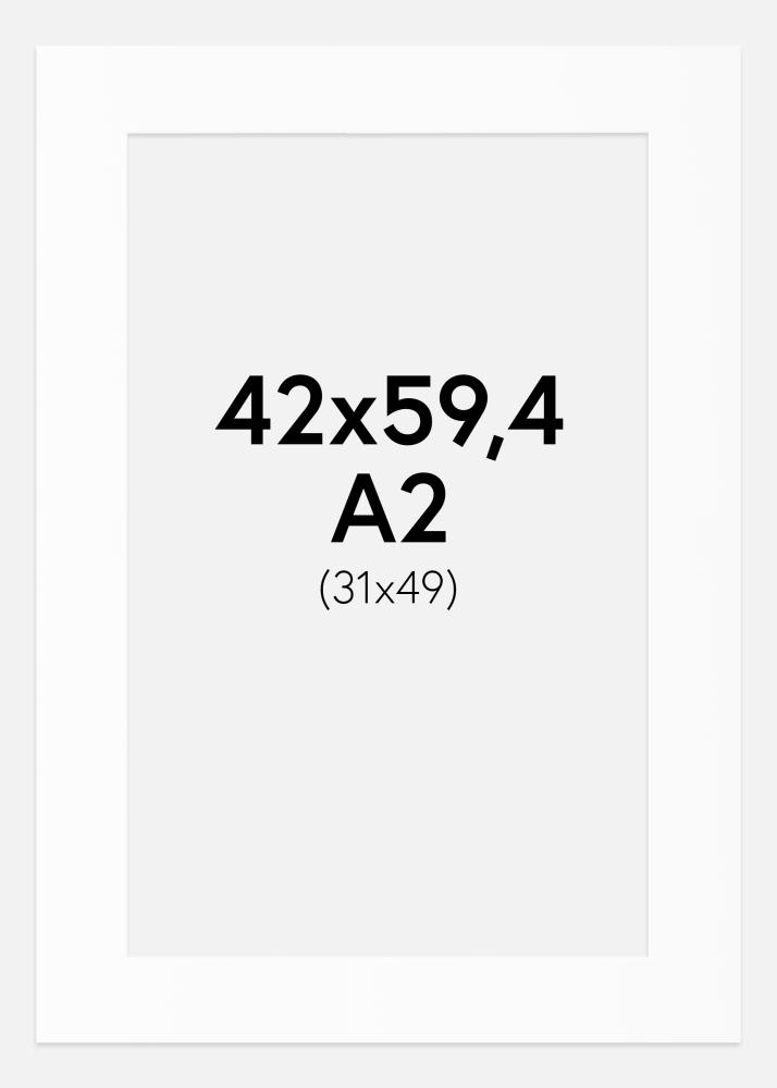 Αυτό το κομψό passepartout σε λευκή απόχρωση είναι η τέλεια επιλογή για να αναδείξετε τις φωτογραφίες και τα έργα τέχνης σας. Με μια λοξότμητη εσωτερική άκρη στο ίδιο λευκό χρώμα δημιουργείται ένα κομψό πλαίσιο που δίνει βάθος και διάσταση στο θέμα σας. Το passepartout είναι σχεδιασμένο να ταιριάζει σε εικόνες με μέγεθος 32x50 cm, ενώ οι εξωτερικές διαστάσεις είναι 42x59.4 cm, που αντιστοιχούν στη μορφή A2.