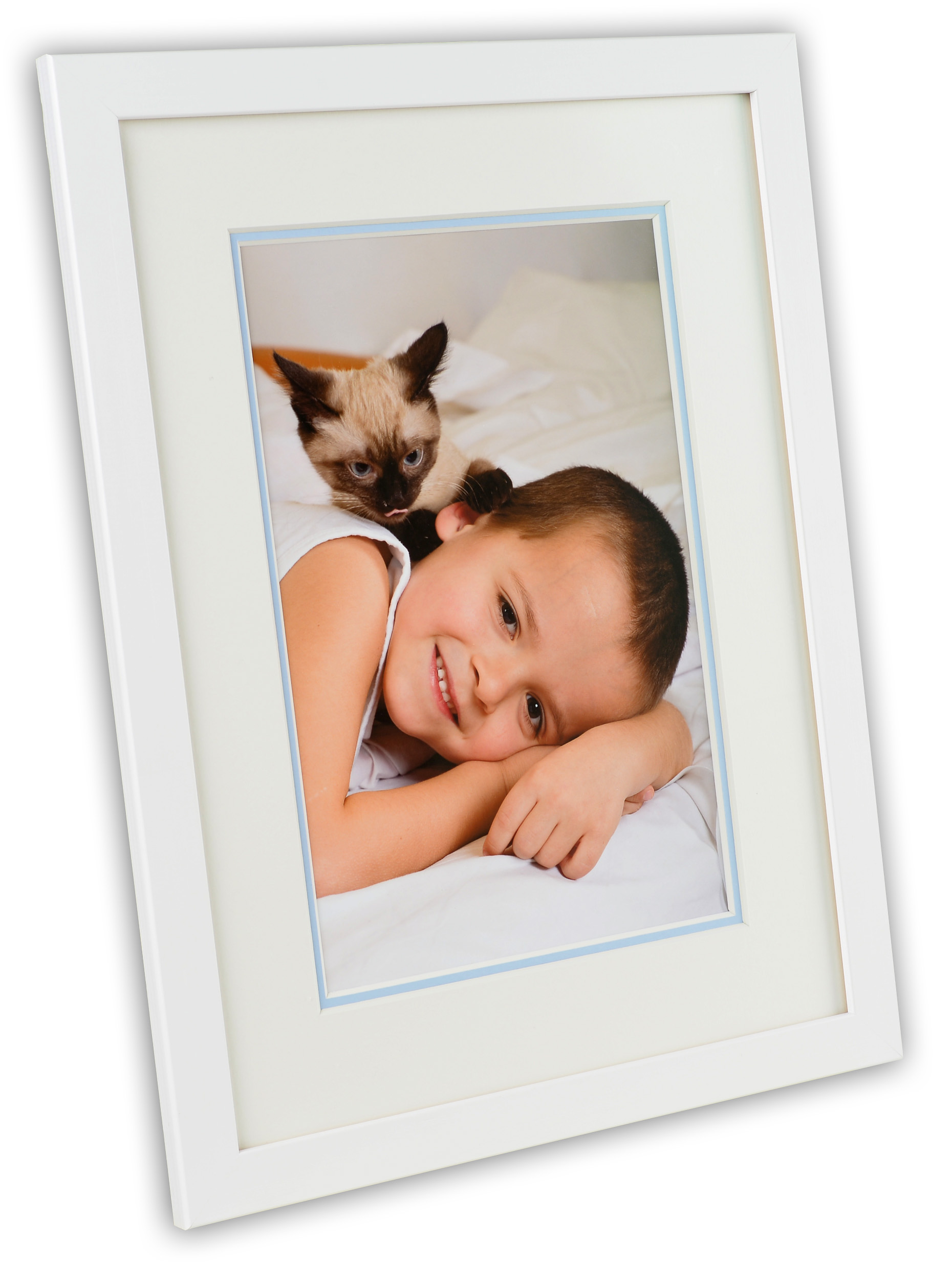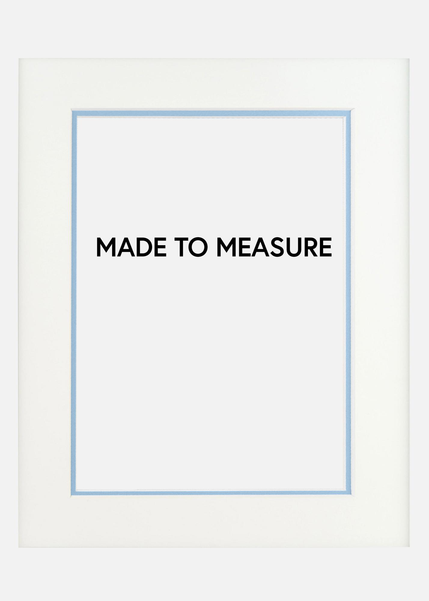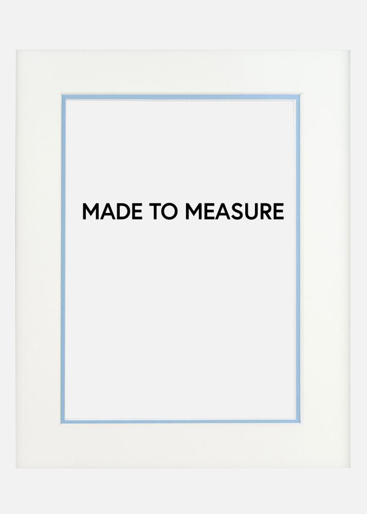 Προσαρμοσμένο passepartout σε δύο στρώσεις με λευκό passepartout ως βάση και ένα κάτω στρώμα σε ανοιχτό μπλε που δημιουργεί μια έγχρωμη άκρη 5 mm γύρω από την εικόνα. Ιδανικό όταν θέλετε να κάνετε μια εντυπωσιακή κορνίζα που αναδεικνύει την εικόνα σας και δίνει ένα επιπλέον βάθος στο θέμα. Όλες οι passepartouter μας έχουν καλαίσθητα κομμένες άκρες σε γωνία 45 μοιρών, παρέχοντας μια σοβαρή και επαγγελματική κορνίζα στις εικόνες σας.