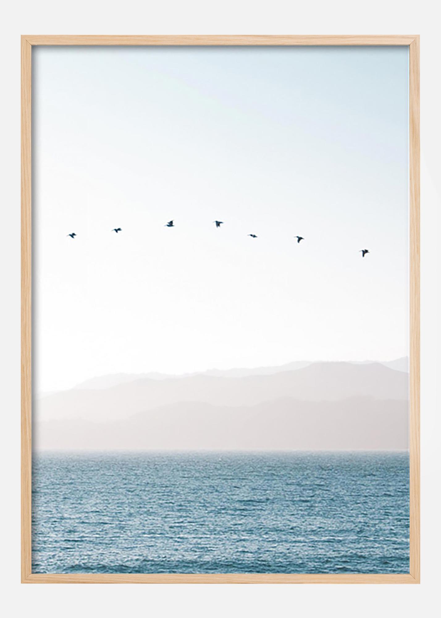 Μια όμορφη φωτογραφία φυσικού τοπίου με πουλιά που πετούν πάνω από γαλάζια νερά μπροστά σε ένα φόντο με βουνά καλυμμένα από ομίχλη και ένα λευκό ουρανό. Μια ήρεμη και αρμονική αφίσα σε δροσιστικές αποχρώσεις που ταιριάζει εξίσου καλά στο μπάνιο όσο και στο υπνοδωμάτιο ή το σαλόνι.
