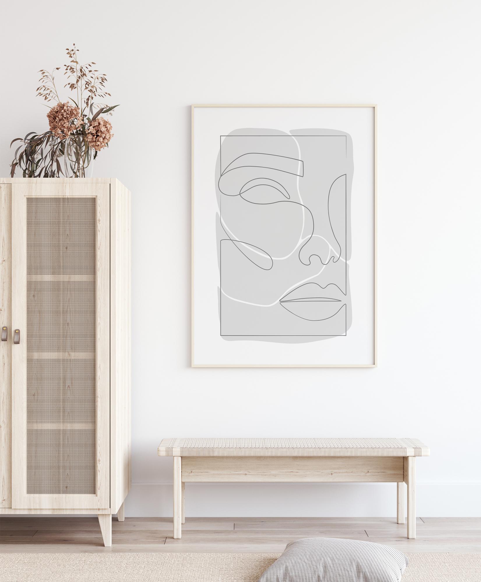 Μια όμορφη αφίσα με το πρόσωπο μιας γυναίκας. Το απλό σχέδιο γραμμής σε μαύρο είναι σχεδιασμένο σε γκρι φόντο και σκιαγραφεί τη μύτη, τα χείλη, το μάτι και το φρύδι της γυναίκας. Για να προσθέσετε λίγο λευκό σε αυτή την όμορφη εκτύπωση, έχει προστεθεί μια πινελιά λευκού αναδεικνύοντας το μάτι και το μάγουλο της γυναίκας. Ένα όμορφο εκτύπωμα για όλες τις γυναίκες.