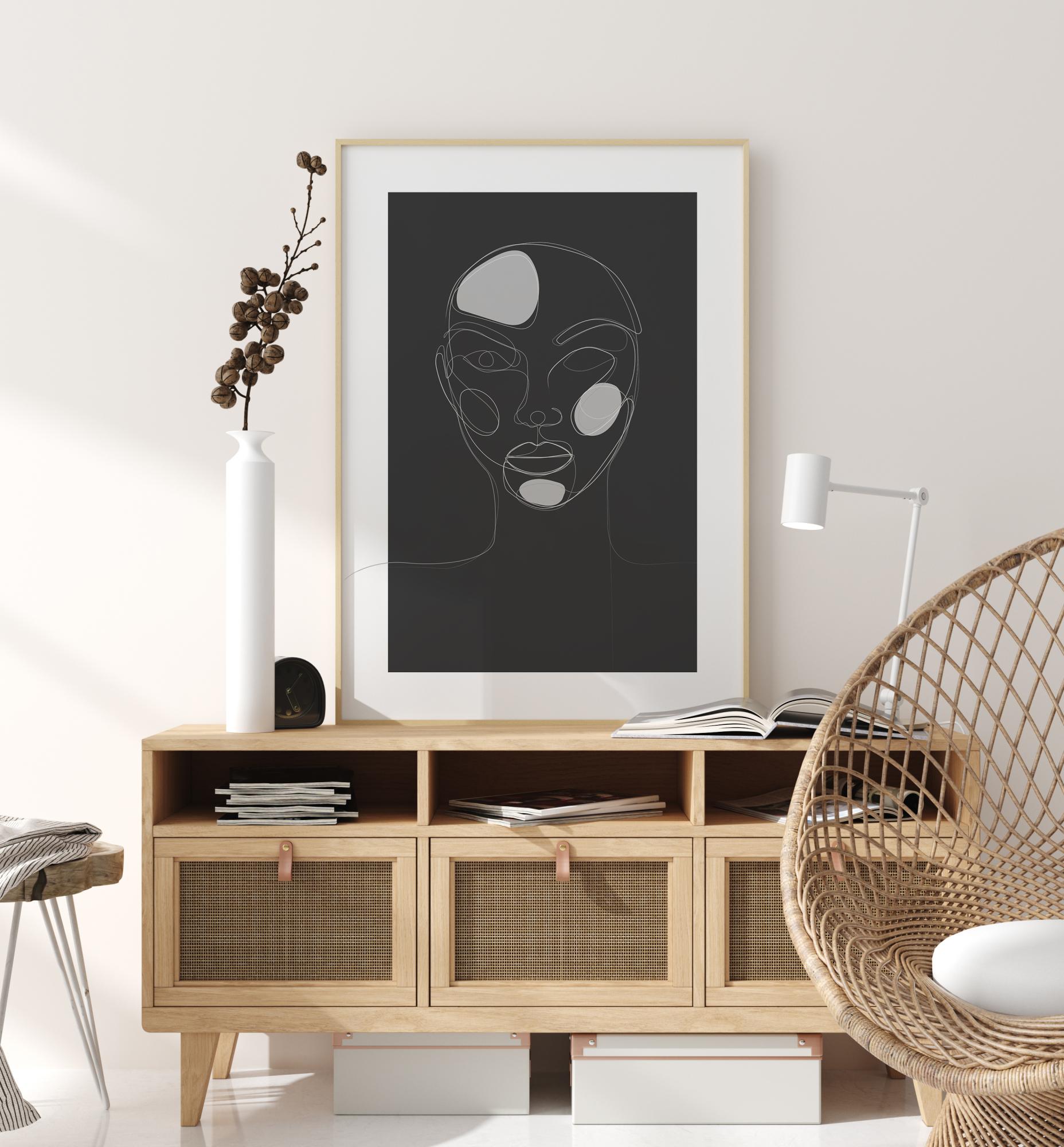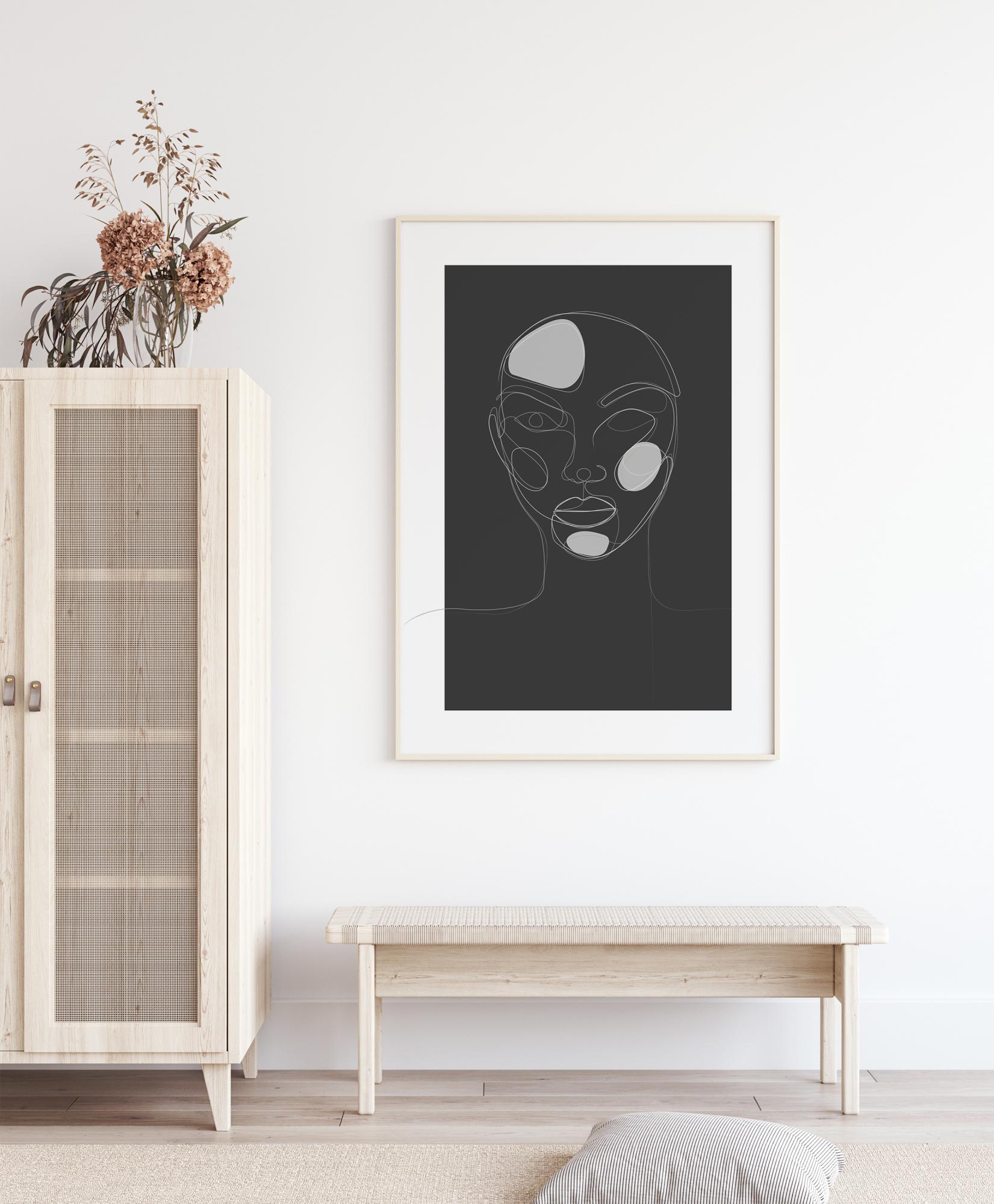 Μια φανταστική αφίσα με το κεφάλι και τους ώμους μιας γυναίκας σχεδιασμένη σε μαύρο φόντο. Τρεις λευκές κηλίδες επισημαίνουν το μέτωπο, το μάγουλο και το πηγούνι της γυναίκας. Η εκτύπωση είναι ένα απλό γραμμικό σχέδιο με όλα τα χαρακτηριστικά περιγραμμένα σε λευκό. Ένα ισχυρό εκτύπωμα για να κρεμαστεί στο σπίτι.