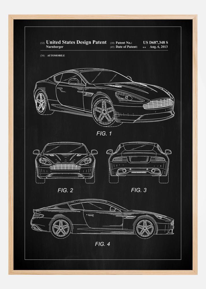 Αυτή η ασπρόμαυρη αφίσα ευρεσιτεχνίας παρουσιάζει τον αποκλειστικό σχεδιασμό μιας Aston Martin, καταχωρημένη υπό τον αριθμό ευρεσιτεχνίας των Ηνωμένων Πολιτειών US D687,348 S με ημερομηνία 6ης Αυγούστου 2013. Η αφίσα ευρεσιτεχνίας αναδεικνύει τη αισθητική και λειτουργική επανάσταση στη βιομηχανία αυτοκινήτων και αποτελεί έναν φόρο τιμής στις προόδους στο σχεδιασμό των αυτοκινήτων. Είναι μια δημιουργική λεπτομέρεια για όλους όσους εκτιμούν τον τεχνικό σχεδιασμό και είναι απαραίτητο για συλλέκτες και λάτρεις της τεχνολογίας.