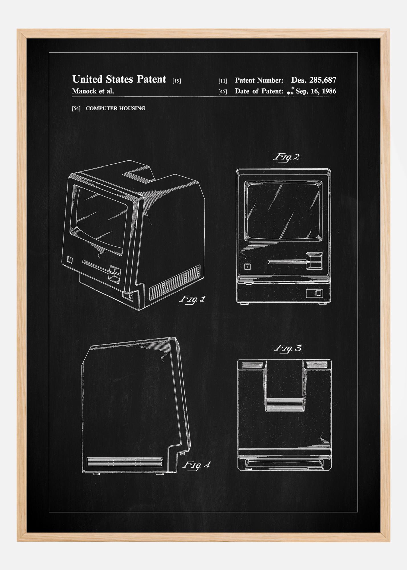 Αυτή η αφίσα ευρεσιτεχνίας δείχνει το σχέδιο ενός κουτιού υπολογιστή για Macintosh ή Mac, αντιπροσωπευόμενο από το Αμερικανικό Δίπλωμα Ευρεσιτεχνίας Σχεδίασης Des. 285,687, εκδοθέν στις 16 Σεπτεμβρίου 1986. Η σχεδίαση αναδεικνύει το κλασικό στυλ των περιβλημάτων υπολογιστών από τα μέσα της δεκαετίας του 1980, μια εποχή όπου οι προσωπικοί υπολογιστές άρχισαν να γίνονται συνηθισμένοι σε σπίτια και γραφεία. Το διακριτικό σχήμα και στυλ της αντικατοπτρίζει τα τεχνικά και αισθητικά ιδεώδη εκείνης της εποχής.
