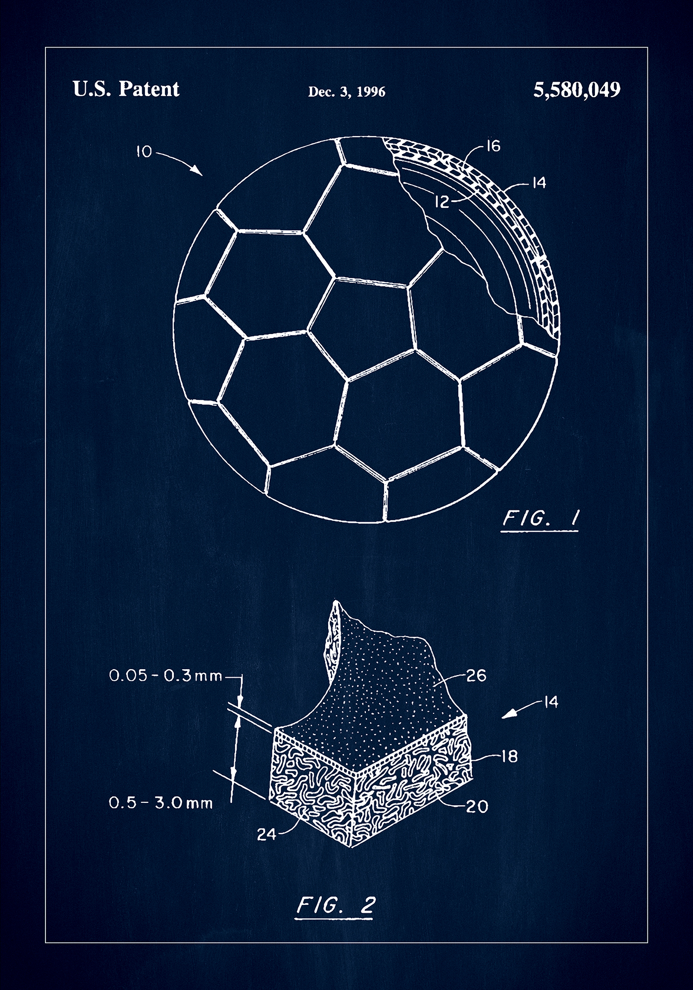 Αυτή η κομψή αφίσα ευρεσιτεχνίας παρουσιάζει την ακριβή καλλιτεχνική απεικόνιση του Αμερικανικού Διπλώματος Ευρεσιτεχνίας 5,580,049, το οποίο καταχωρήθηκε επίσημα στις 3 Δεκεμβρίου 1996. Η αφίσα είναι ένας τέλειος συνδυασμός τεχνολογίας και τέχνης, και το μονοχρωματικό της στυλ την καθιστά διαχρονικό διακοσμητικό στοιχείο. Παρουσιάζει ένα σχέδιο ευρεσιτεχνίας μιας ποδοσφαιρικής μπάλας σε δύο φιγούρες: η πρώτη δείχνει τον συνολικό σχεδιασμό της μπάλας, ενώ το δεύτερο μέρος παρέχει μια λεπτομερή άποψη μιας τομής μέσω της επιφάνειας της μπάλας, φωτίζοντας την υποκείμενη δομή και διαστάσεις.