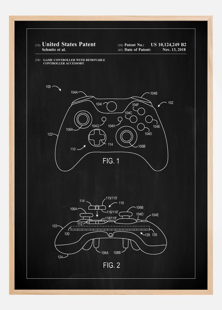 Αυτή η αφίσα ευρεσιτεχνίας με μαύρο πίνακα στο παρασκήνιο αναδεικνύει κομψά έναν σύγχρονο χειριστήριο για το Xbox με αποσπώμενο εξάρτημα, αριθμός ευρεσιτεχνίας US 10,124,249 B2, ημερομηνίας 13 Νοεμβρίου 2018. Ο προχωρημένος σχεδιασμός και τα συστατικά του απεικονίζονται οπτικά λεπτομερώς, παρέχοντας διορατικότητα στο πώς η τεχνολογία και η εμπειρία παιχνιδιού μπορούν να προσαρμοστούν για τον χρήστη. Είναι μια εκδήλωση της συνεχούς καινοτομίας που συμβαίνει στον κόσμο των χειριστηρίων παιχνιδιών.