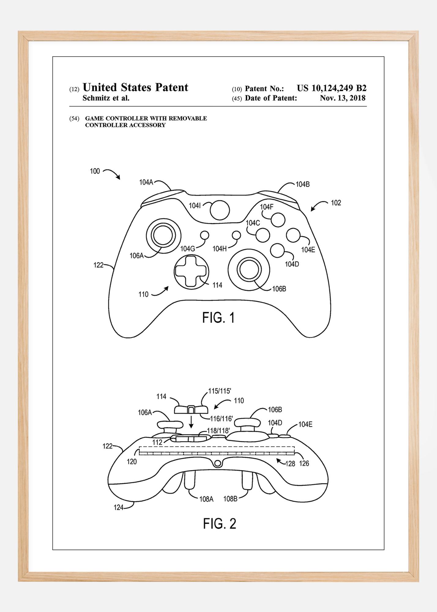 Αυτή η αφίσα με διπλώματα ευρεσιτεχνίας δείχνει έναν προηγμένο χειριστή παιχνιδιών για το Xbox με αποσπώμενο εξάρτημα, αριθμός διπλώματος ευρεσιτεχνίας US 10,124,249 B2, με ημερομηνία 13 Νοεμβρίου 2018. Ο σχεδιασμός, ο οποίος εμφανίζεται σε πολλές όψεις, αποκαλύπτει έναν υψηλό βαθμό προσαρμοστικότητας και καινοτομίας στο υλικό παιχνιδιών, παρέχοντας μια εικόνα για το πώς μπορεί να βελτιωθεί η διαδραστικότητα και η εμπειρία του παίκτη μέσω τεχνικού σχεδιασμού.