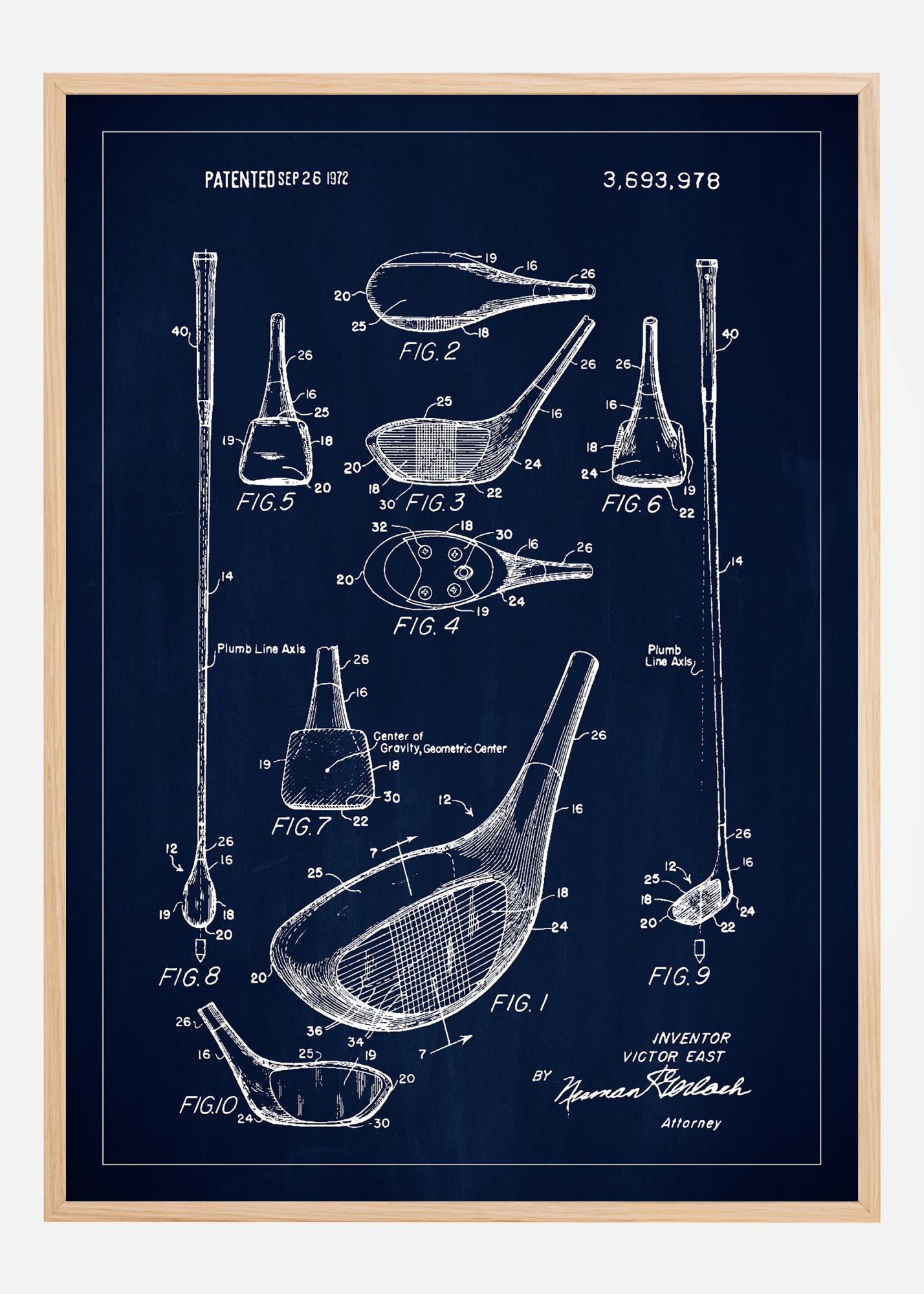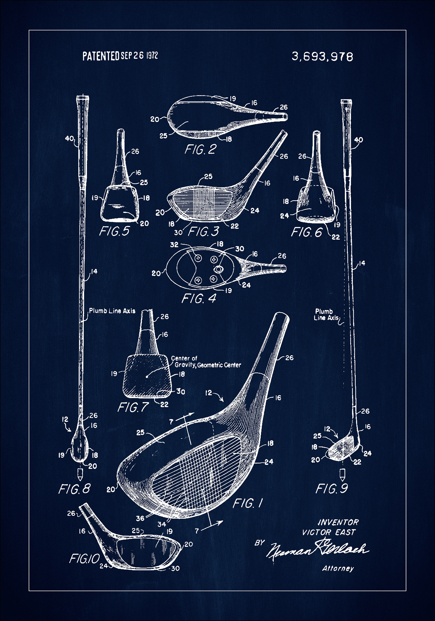 Αυτή η κομψή αφίσα με πατέντα παρουσιάζει μια προσεκτικά λεπτομερή εικονογράφηση μιας πατέντας για ένα γκολφ κλαμπ, που χορηγήθηκε στις 26 Σεπτεμβρίου 1972, υπό τον αριθμό πατέντας 3,693,978. Κάθε πτυχή του σχεδιασμού είναι εκτεθειμένη μέσω μιας σειράς από στοχαστικές μορφές, από πλήρεις τομές μήκους έως λεπτομερείς περιλήψεις της κεφαλής του κλαμπ. Αυτή η επιδέξια εκτελεσμένη σχεδίαση πατέντας είναι ένας φόρος τιμής στις τεχνολογικές εξελίξεις του αθλήματος και αναδεικνύει την ευφυΐα και την ακρίβεια του εφευρέτη.