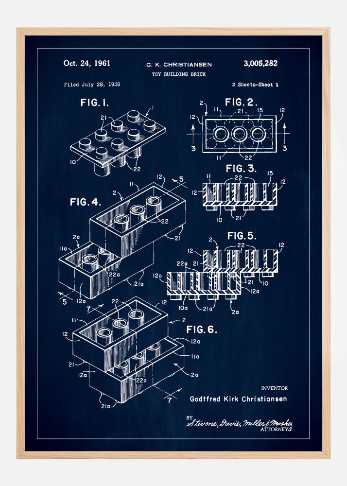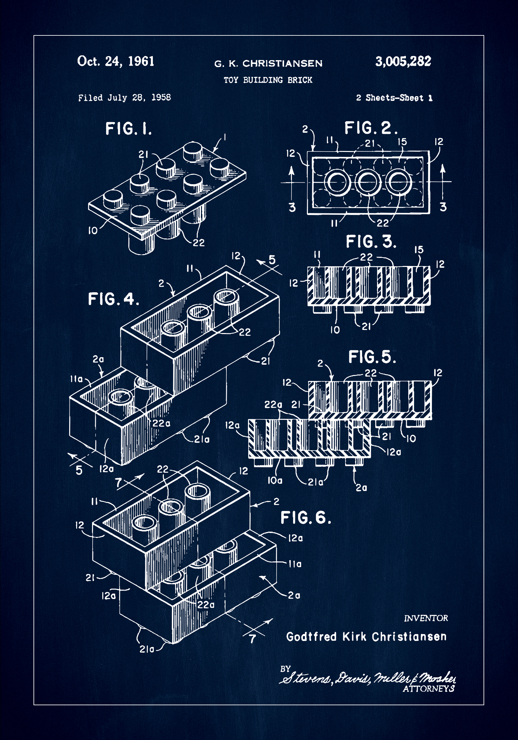 Αυτή η λεπτομερής αφίσα ευρεσιτεχνίας απεικονίζει την ευφυή σχεδίαση του δομικού παιχνιδιού από το Lego που άλλαξε το παιχνίδι της δημιουργικής παιχνιδοποίησης και εκμάθησης, δημιουργημένη από τον Godtfred Kirk Christiansen. Με αριθμό ευρεσιτεχνίας 3,005,282, χορηγημένος στις 24 Οκτωβρίου 1961, αυτή η εικονογράφηση αποτυπώνει την ουσία μιας εφεύρεσης που έχει εμπνεύσει και ευχαριστήσει γενιές κατασκευαστών και στοχαστών.