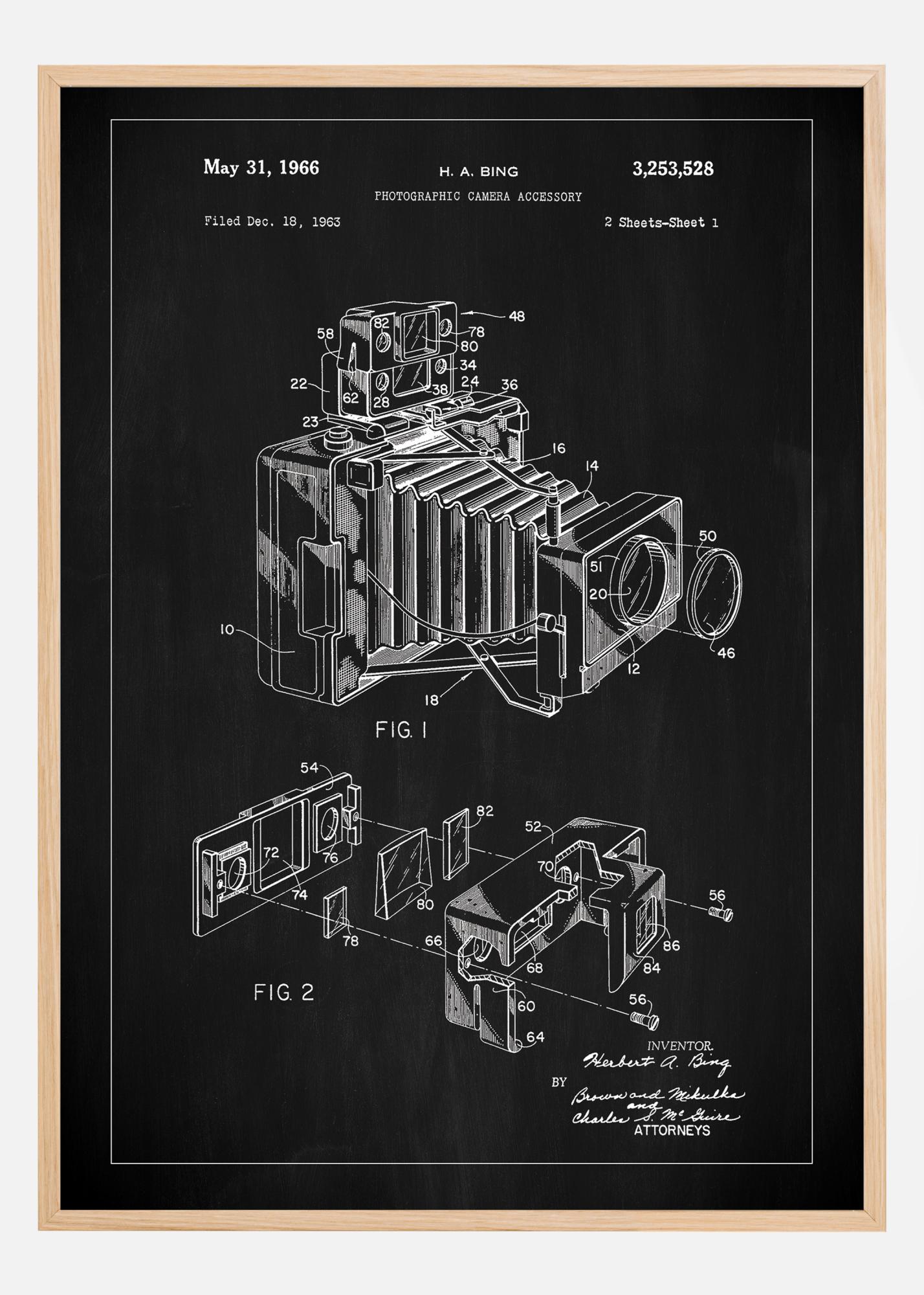 Αυτή η εκλεπτυσμένη αφίσα διπλώματος ευρεσιτεχνίας με μαύρο φόντο προσφέρει μια δυνατή και κομψή παρουσίαση ενός φωτογραφικού αξεσουάρ κάμερας, αριθμός διπλώματος ευρεσιτεχνίας 3,253,528, εκδοθείσα στις 31 Μαΐου 1966. Με την αιχμηρή εικονογράφηση με λευκές γραμμές που ξεχωρίζει στο σκοτεινό φόντο, το σχέδιο προσφέρει μια λεπτομερή άποψη μιας τεχνολογικής καινοτομίας που προήγαγε την τέχνη της φωτογραφίας. Η αφίσα διπλώματος ευρεσιτεχνίας είναι ένα αφιέρωμα στην εποχή που η φωτογραφία άρχισε να κάνει μεγάλα βήματα στην τεχνολογική ανάπτυξη.