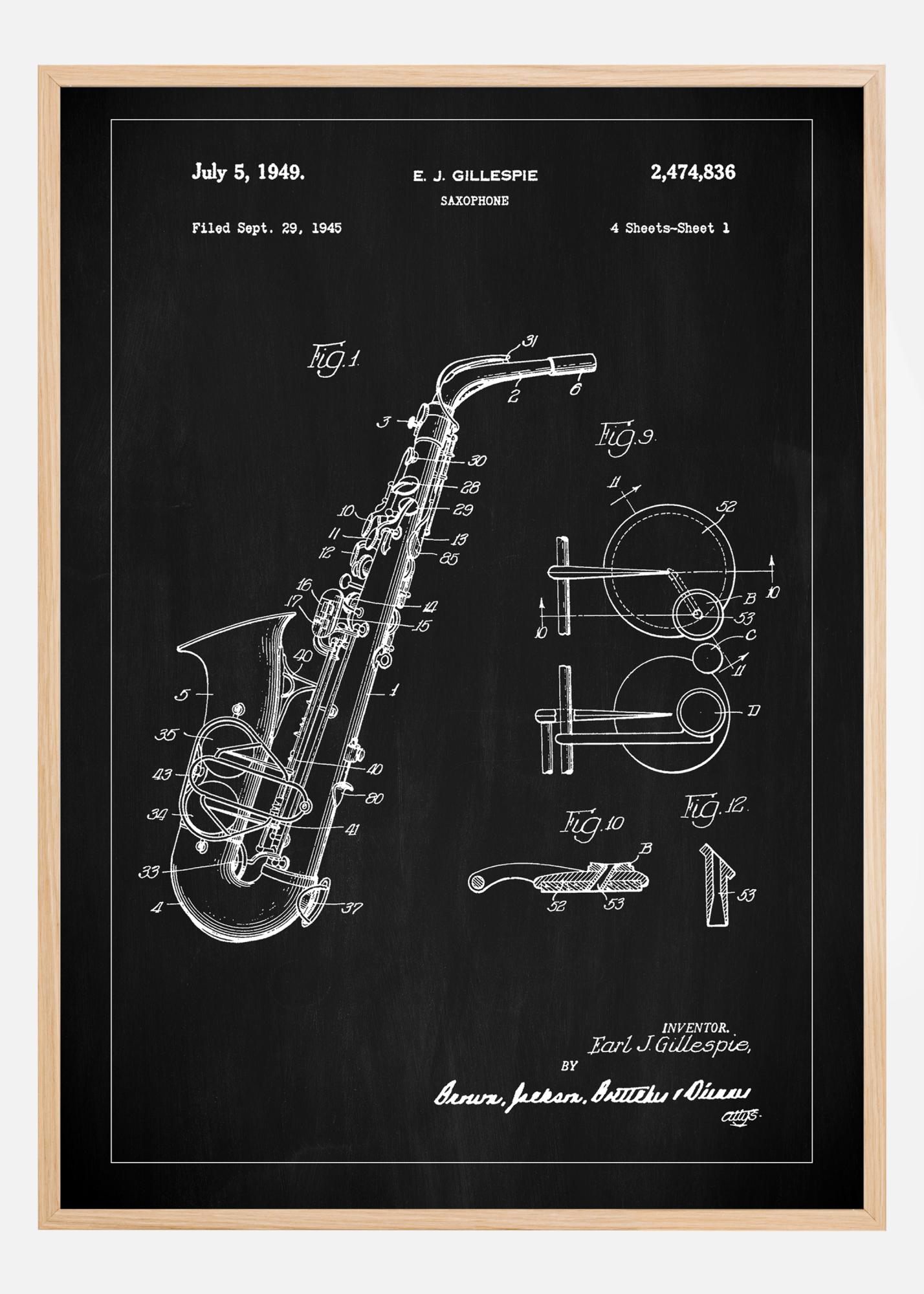 Το μαύρο φόντο προσφέρει μια τολμηρή και μοντέρνα αντίθεση που αναδεικνύει τις λευκές γραμμές και δημιουργεί ένα εντυπωσιακό οπτικό εφέ που τραβά την προσοχή του θεατή. Για τους λάτρεις της τζαζ, τους μουσικούς ιστορικούς, και τους λάτρεις του σχεδιασμού, αυτή η σχεδίαση διπλώματος ευρεσιτεχνίας προσφέρει μια καλλιτεχνική και ιστορική οπτική σε ένα από τα πιο εμβληματικά μουσικά όργανα όλων των εποχών. Μια αφίσα διπλώματος ευρεσιτεχνίας σαν αυτή είναι κάτι περισσότερο από ένα διακοσμητικό στοιχείο· είναι ένας φόρος τιμής στην καινοτομία και την μουσική έκφραση που αντιπροσωπεύει το σαξόφωνο.