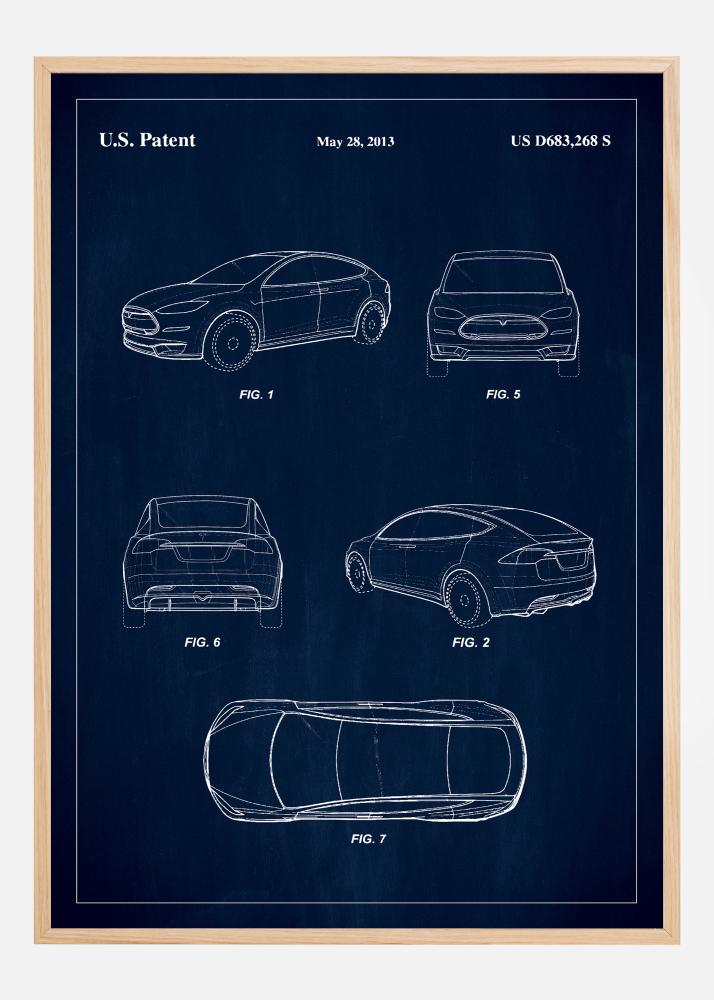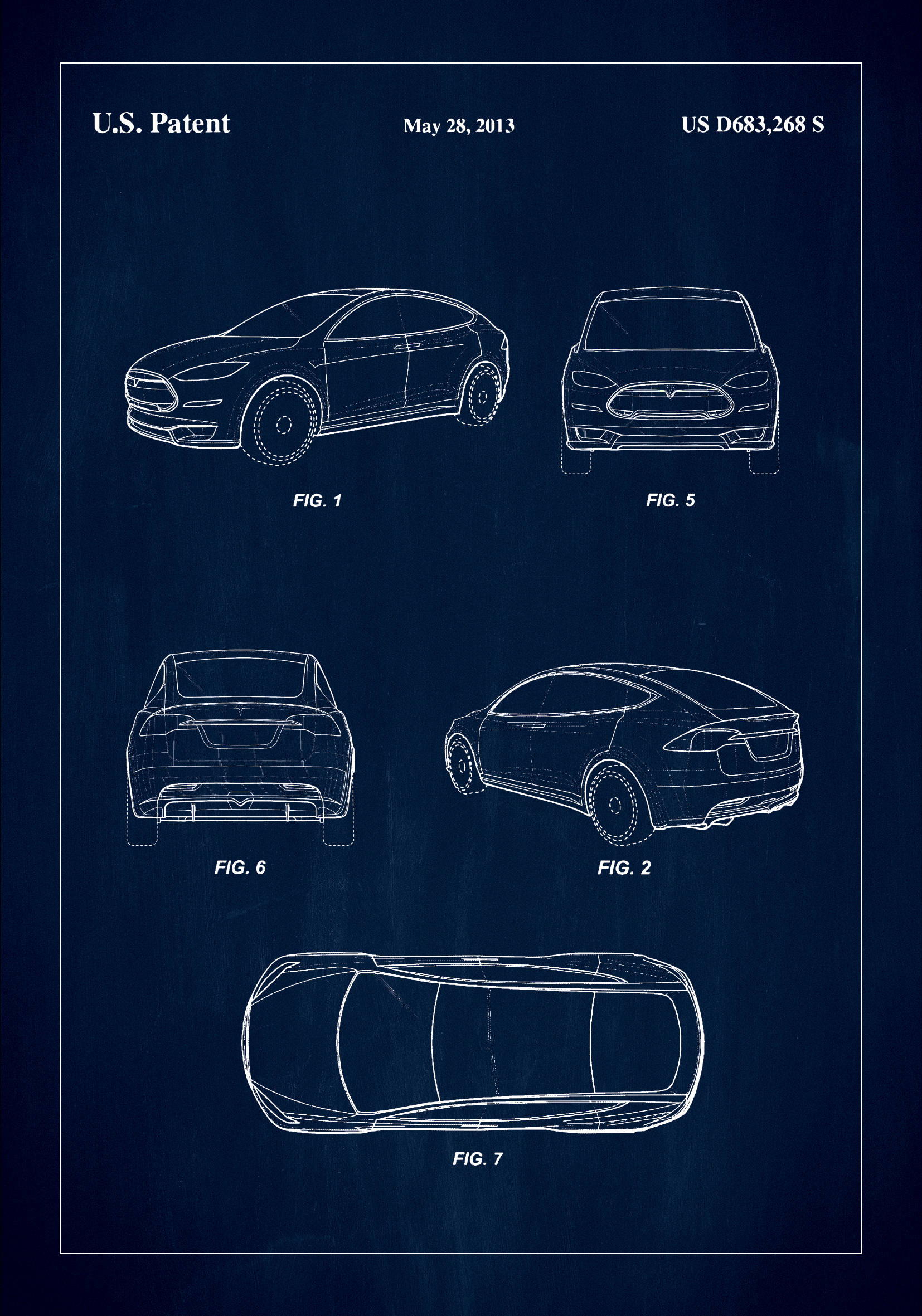 Με υπερηφάνεια σας παρουσιάζουμε αυτήν την αφίσα πατέντας, μια γραφική αναπαράσταση της US D683,268 S, που χορηγήθηκε στις 28 Μαΐου 2013, η οποία απεικονίζει έναν σχεδιασμό οχήματος από την Tesla που είναι εξίσου καινοτόμος όσο και αισθητικά ελκυστικός. Η αφίσα είναι ένα ιδανικό συμπλήρωμα για κάθε συλλεκτική κατοικία ή χώρο εργασίας, προσφέροντας μια μοναδική ματιά στη διαδικασία σχεδίασης πίσω από μια από τις πιο εξέχουσες μορφές στην αυτοκινητοβιομηχανία.