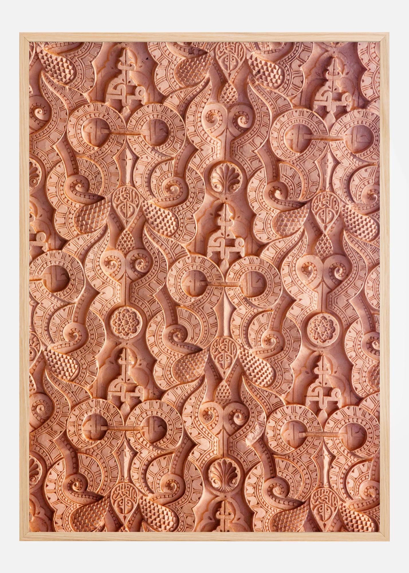 Τα χρώματα στο μοτίβο μένουν εντός μιας παλέτας από ζεστά τερακότα και πηλό, δίνοντας μια φυσική και ρουστίκ αίσθηση στην εικόνα. Το λεπτομερές σχέδιο ξεχωρίζει καλά επάνω στο ενιαίο φόντο και δημιουργεί μια τρισδιάστατη ψευδαίσθηση που είναι ταυτόχρονα ελκυστική και βαθιά. Αυτή η αφίσα είναι ιδανική για όποιον εκτιμά την τέχνη που κεντρίζει την προσοχή και προσκαλεί σε πιο προσεκτική μελέτη, και που εκτιμά την δεξιοτεχνία και την παράδοση στο στυλ της διακόσμησής του.