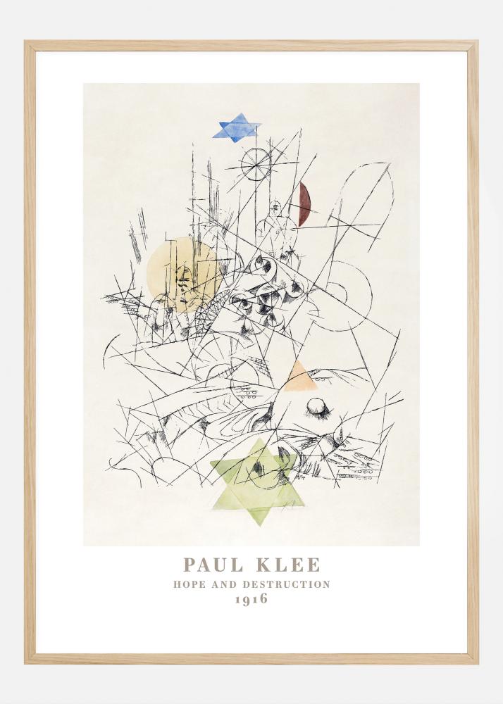 Αυτή η καλλιτεχνική αφίσα απεικονίζει ένα έργο του Paul Klee, με τίτλο "Ελπίδα και Καταστροφή" από το 1916, και αιχμαλωτίζει έναν μοναδικό συνδυασμό αφηρημένης τέχνης και συμβολισμού που είναι χαρακτηριστικός για το στυλ του Klee. Το θέμα είναι πλούσιο σε γραμμές και σχήματα που αλληλεπιδρούν πάνω στην επιφάνεια της σύνθεσης, προσφέροντας μια αίσθηση τόσο τάξης όσο και χάους. Είναι μια εκτύπωση που θα μπορούσε να απευθύνεται σε εκείνους που εκτιμούν τόσο τη μοντέρνα όσο και τη σύγχρονη τέχνη, ιδανική για να προσθέσει μια σκέψη στοχαστικής διάστασης σε κάθε δωμάτιο ή γραφείο.
