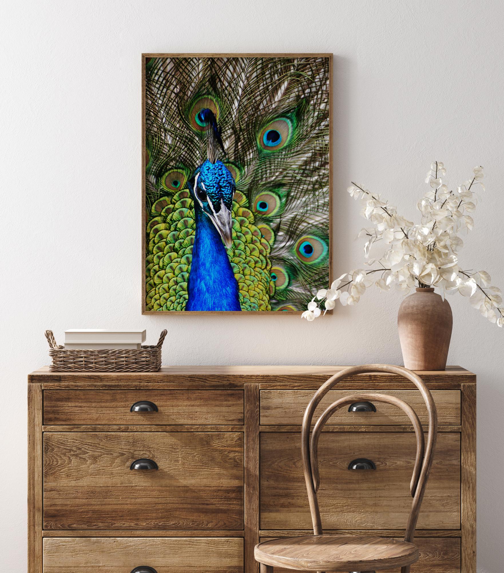 Μια εκπληκτική αφίσα κοντινού πλάνου με έναν παγώνι. Με τα μεγάλα, πολύχρωμα ουρά φτερά του και τα με μοτίβα σαν μάτια, αυτό το πολύχρωμο πλάσμα ακτινοβολεί στο φυσικό ηλιακό φως. Φέρτε την ομορφιά του πουλιού στο σπίτι με αυτήν την τέλεια αφίσα.