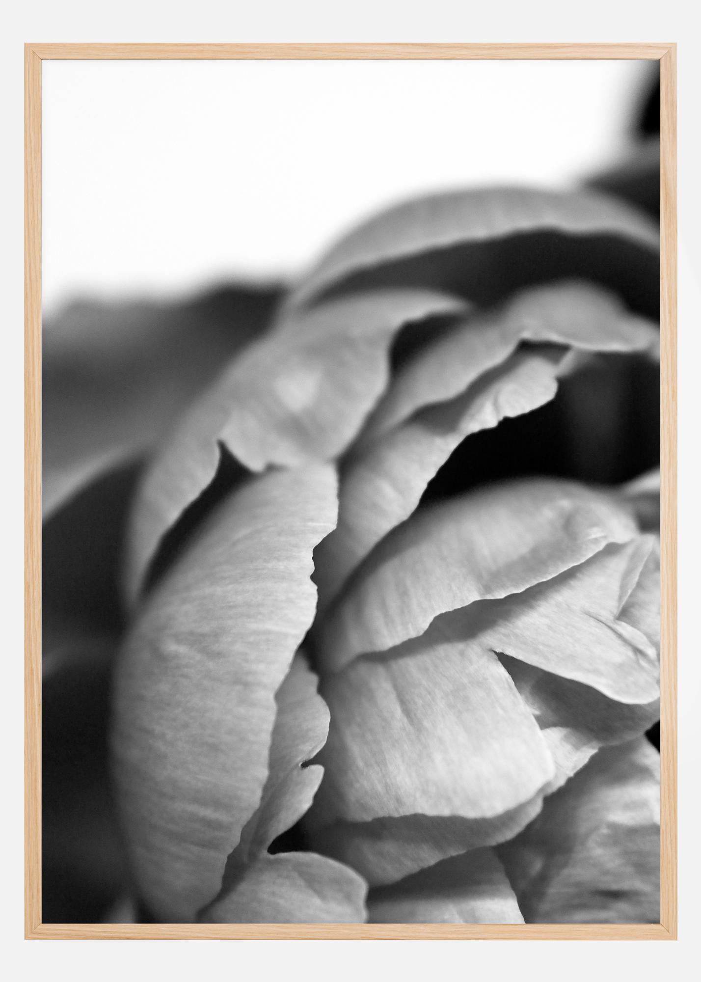Μια αφίσα κοντινής λήψης σε ασπρόμαυρο ενός παιωνία. Τα λευκά πέταλά του κυματίζουν κομψά το ένα πάνω από το άλλο, σχηματίζοντας μια δομή παρόμοια με λάχανο. Με φόντο μια θολή εικόνα, μπορείτε να θαυμάσετε τα τέλεια σχηματισμένα φύλλα αυτού του γλυκού λουλουδιού. Ένα τέλειο τύπωμα για όλους όσους αγαπούν τα λουλούδια.