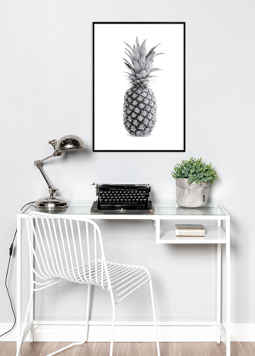 Αφίσα με το αγαπημένο φρούτο του ενδιαφερόμενου για εσωτερική διακόσμηση, τον ανανά, ιδανική για όποιον θέλει να είναι συνειδητός στο σχεδιασμό χωρίς να χρειάζεται συνεχώς να αγοράζει νέα φρούτα. Το ασπρόμαυρο μοτίβο κάνει την αφίσα να ταιριάζει σε όλα τα στιλ εσωτερικής διακόσμησης και σε όλους τους χώρους του σπιτιού, ενώ η εκτύπωση δείχνει επίσης ωραία σε δημόσιο περιβάλλον. Συμπληρώστε με μια λεπτότερη μονόχρωμη κορνίζα που δεν ανταγωνίζεται το μοτίβο και ταιριάζει στο περιβάλλον όπου ο πίνακας θα κρεμαστεί.