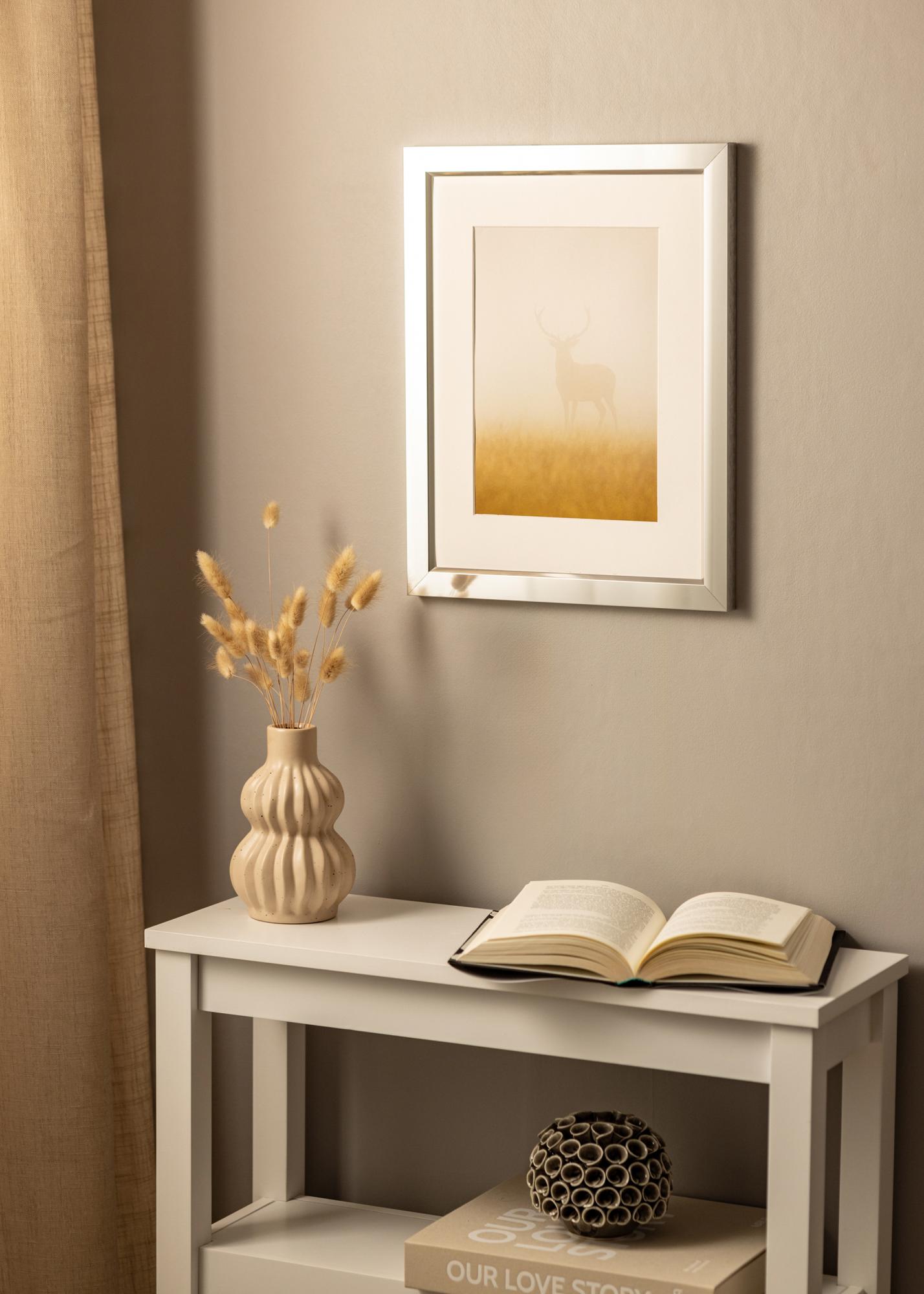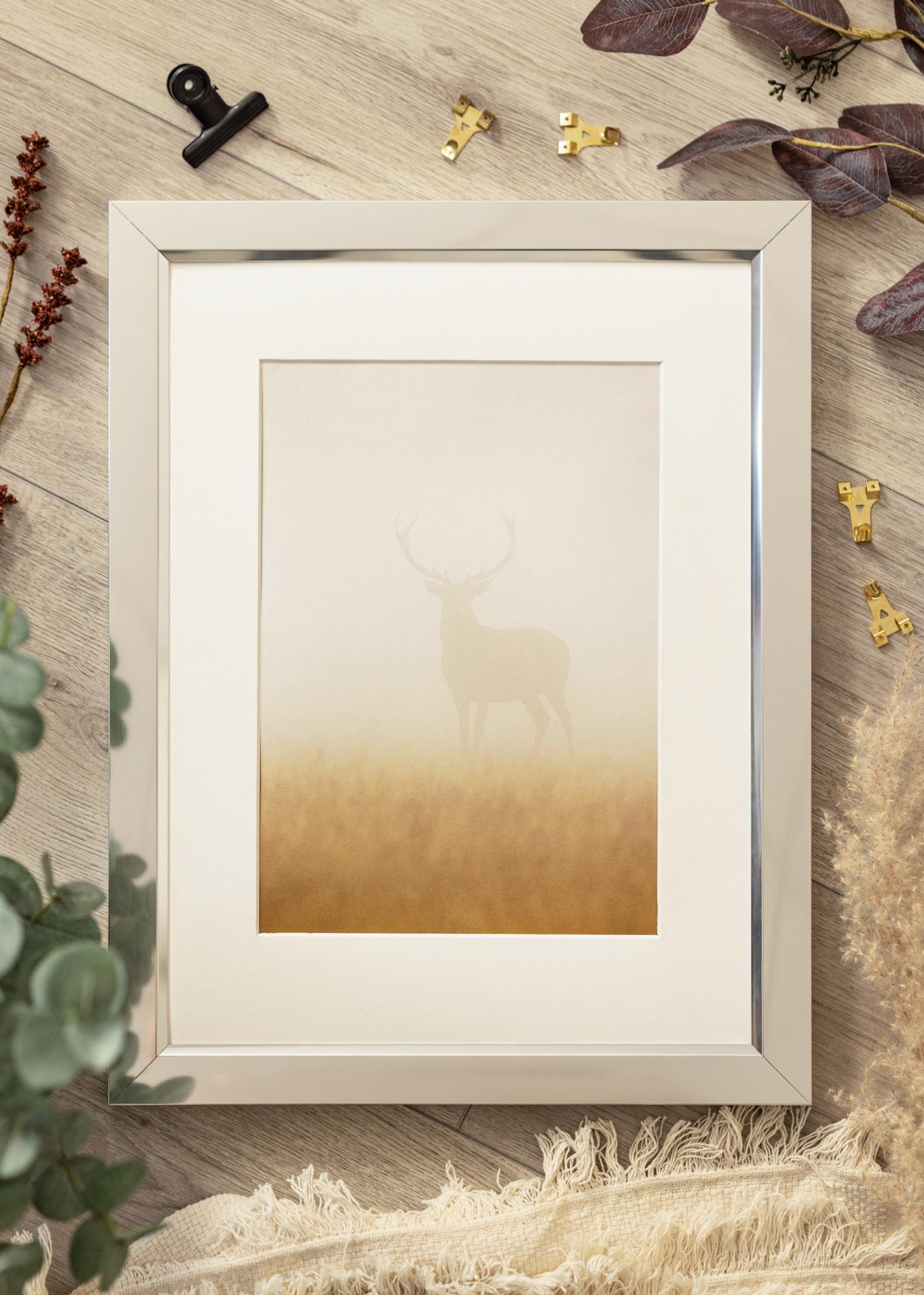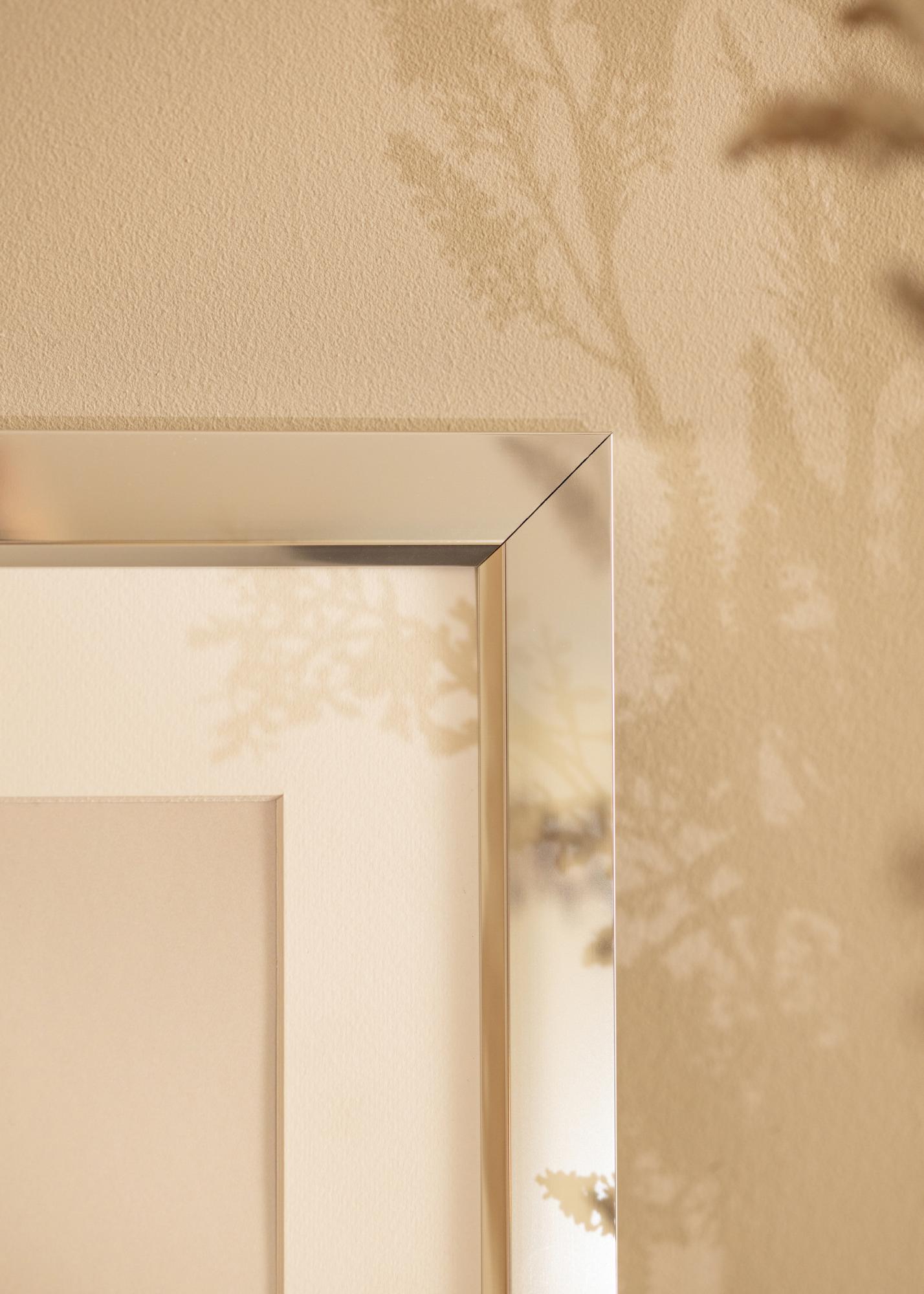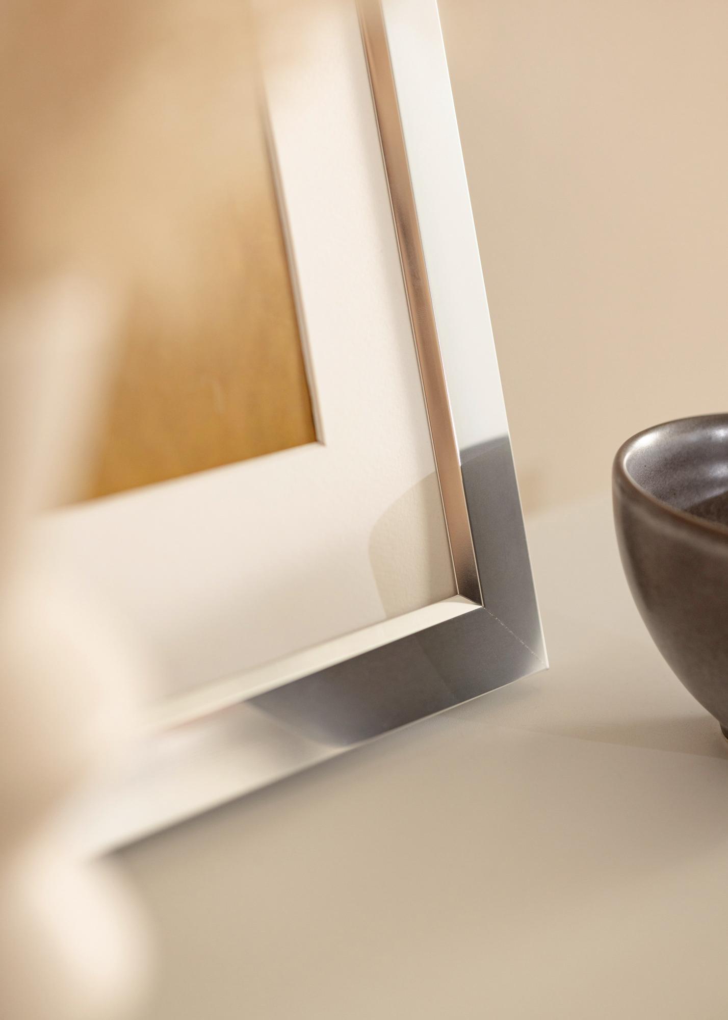 Κομψή γυαλιστερή ασημένια κορνίζα με αίσθηση καθρέπτη, που αποτελείται από μια ποιοτική λίστα κορνίζας κατασκευασμένη από αλουμίνιο στη Γερμανία. Η υψηλής στιλπνότητας εμφάνιση τραβά την προσοχή και αντανακλά το φως με όμορφο τρόπο και εστιάζει στο θέμα. Η μινιμαλιστική γλώσσα σχεδιασμού της κορνίζας της επιτρέπει να εντάσσεται όμορφα σε μοντέρνα εσωτερικούς χώρους, αλλά μπορεί επίσης να γίνει ένα ωραίο διακοσμητικό σε άλλες διακοσμητικές στυλ. Συμπληρώστε την κορνίζα με ένα passepartout για να αναδείξετε την εικόνα.
