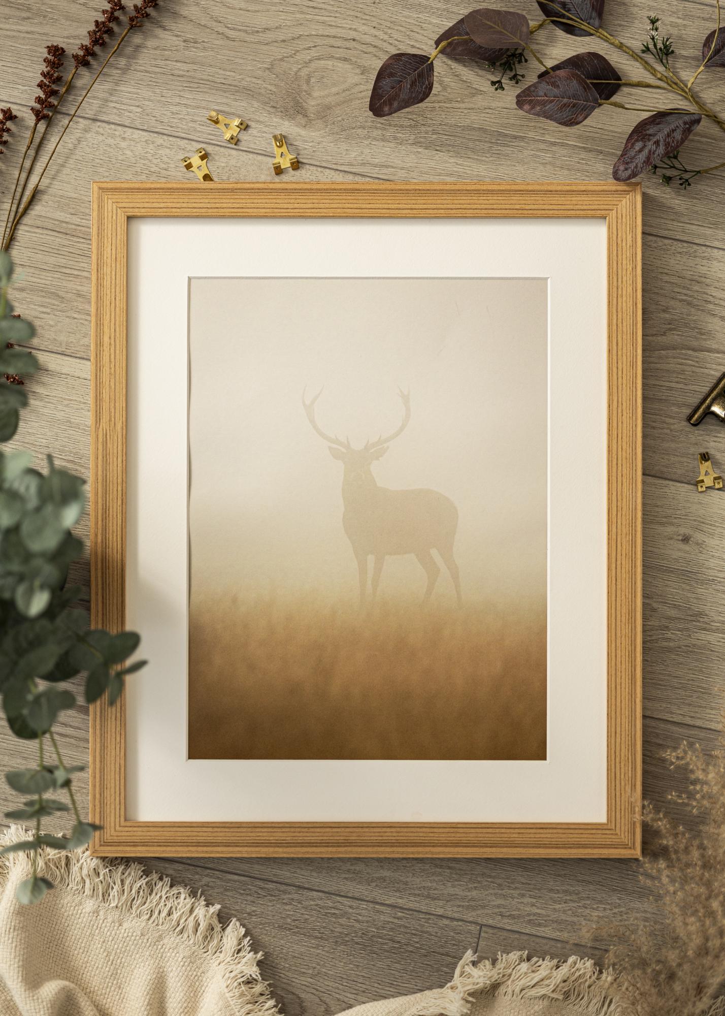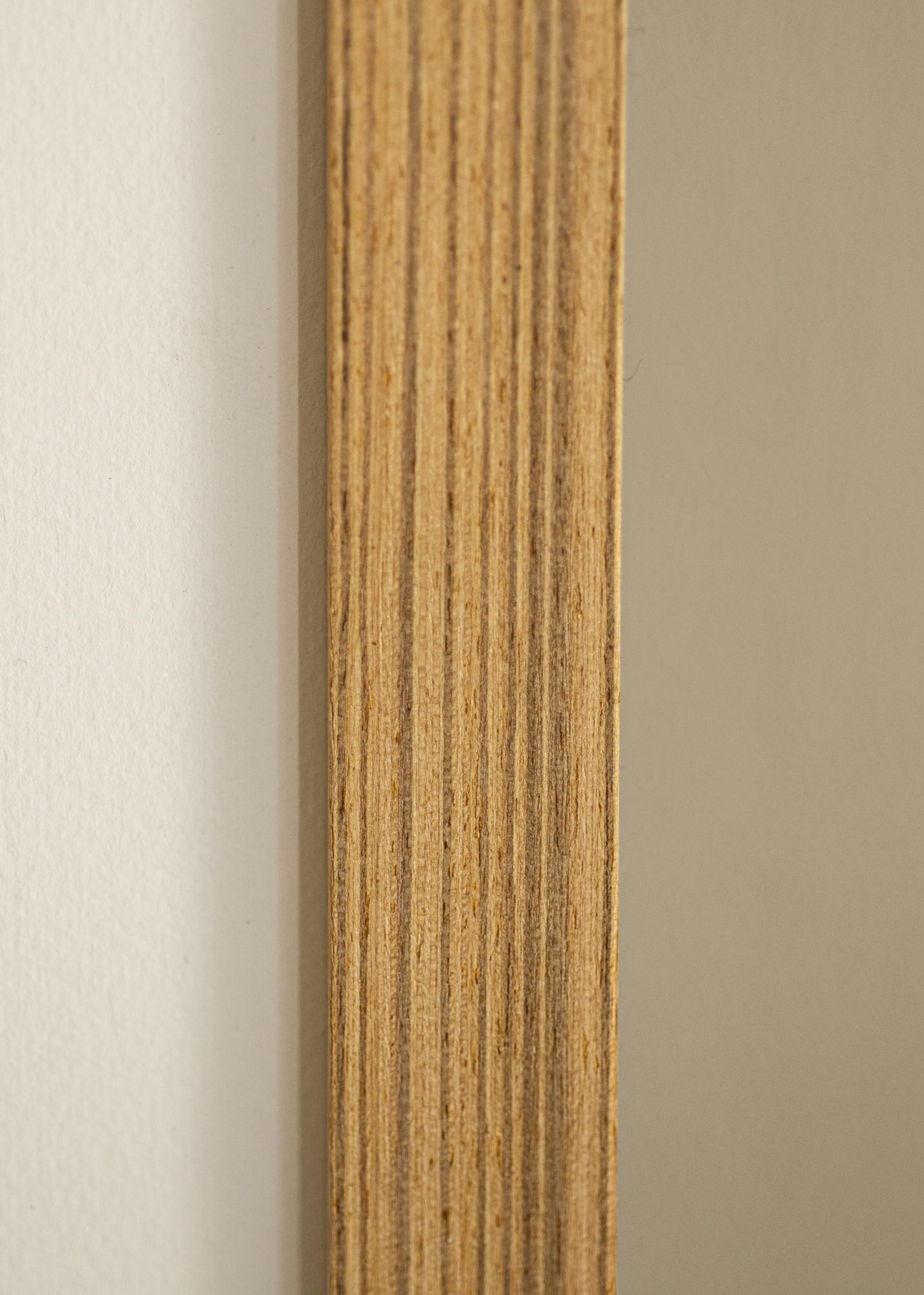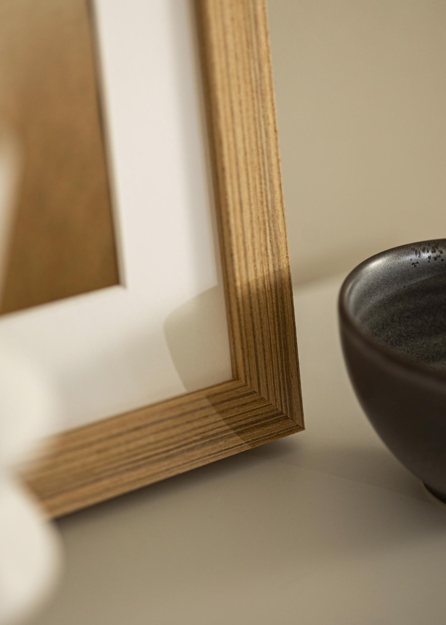 Η ράγα κορνίζας πλάτους 28 mm και βάθους 33 mm προσδίδει στον σκελετό μια στιβαρή και σταθερή αίσθηση. Οι εμφανείς κάθετες ίνες ενισχύουν την αίσθηση του ξύλου και δημιουργούν μια ζωντανή δομή. Η ματ φινίρισμα αναδεικνύει τις φυσικές μεταβολές του δρυός χωρίς να προκαλεί αντανακλαστικά εφέ, καθιστώντας την ιδανική για την προβολή των αγαπημένων σας εικόνων χωρίς αποσπάσεις.