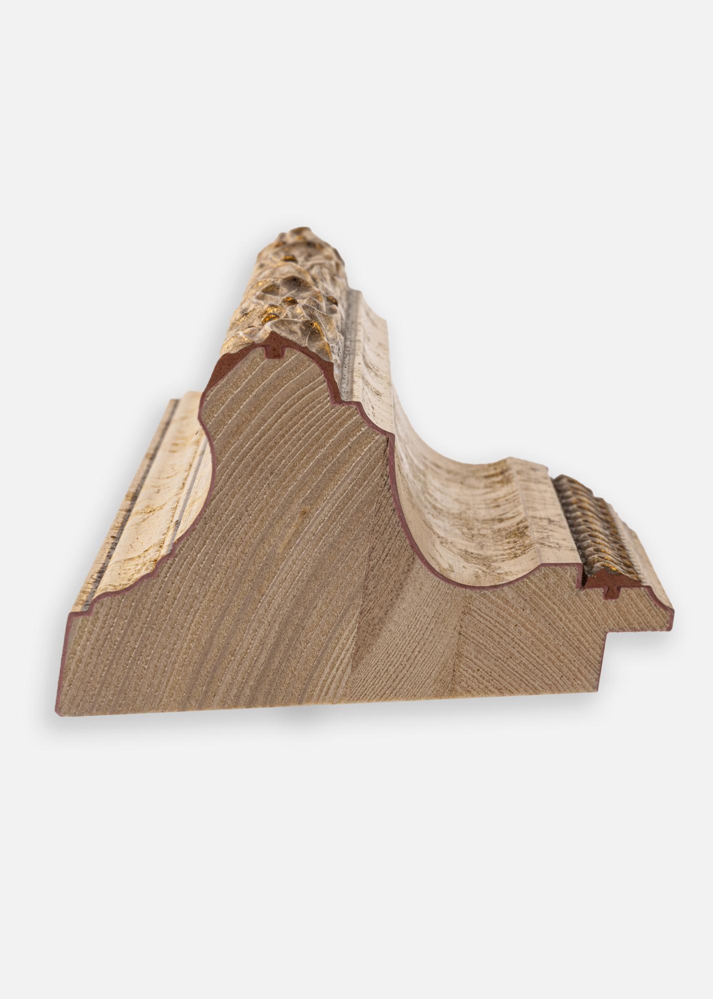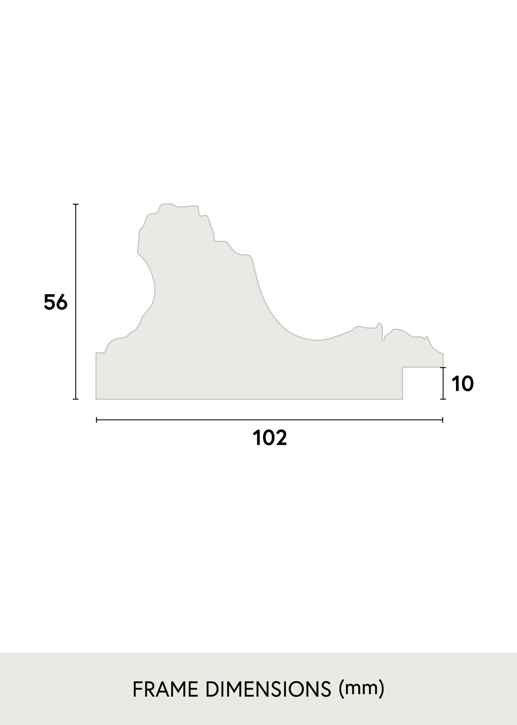 Το ευρύ προφίλ της, στα 102 mm, προσδίδει στην κορνίζα μια εντυπωσιακή παρουσία, ενώ το βάθος της στα 56 mm δημιουργεί ένα στιβαρό και σταθερό πλαίσιο. Τα μικρά κοσμήματα σε σχήμα μαργαριταριού κατά μήκος της εσωτερικής άκρης προσθέτουν μια διακριτική, κλασική πινελιά που ενισχύει την συνολική εικόνα. Η εξωτερική άκρη διακοσμείται με ένα κυματοειδές σχέδιο φύλλων, που προσδίδει έναν σοφιστικέ και διαχρονικό χαρακτήρα στο πλαίσιο.