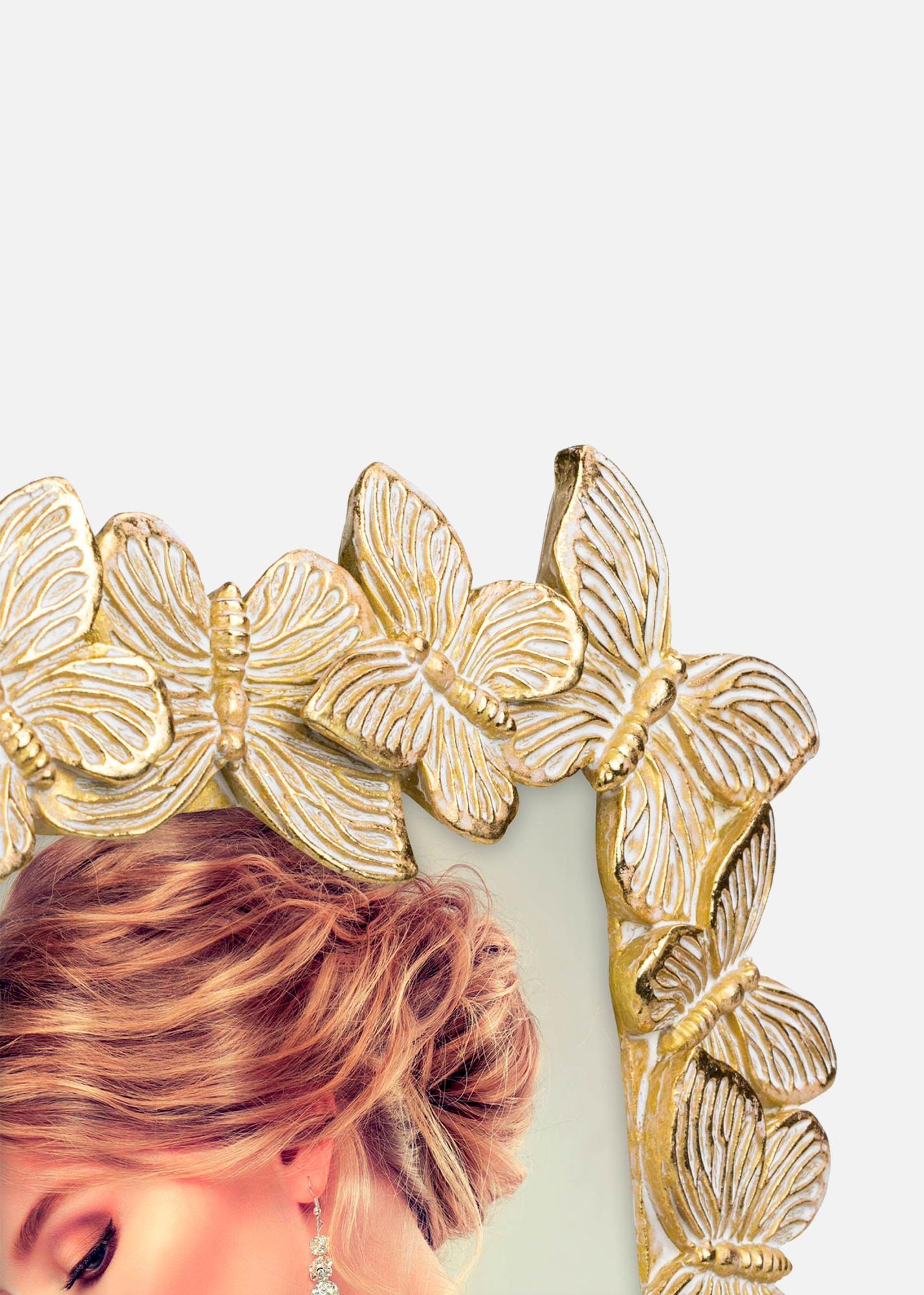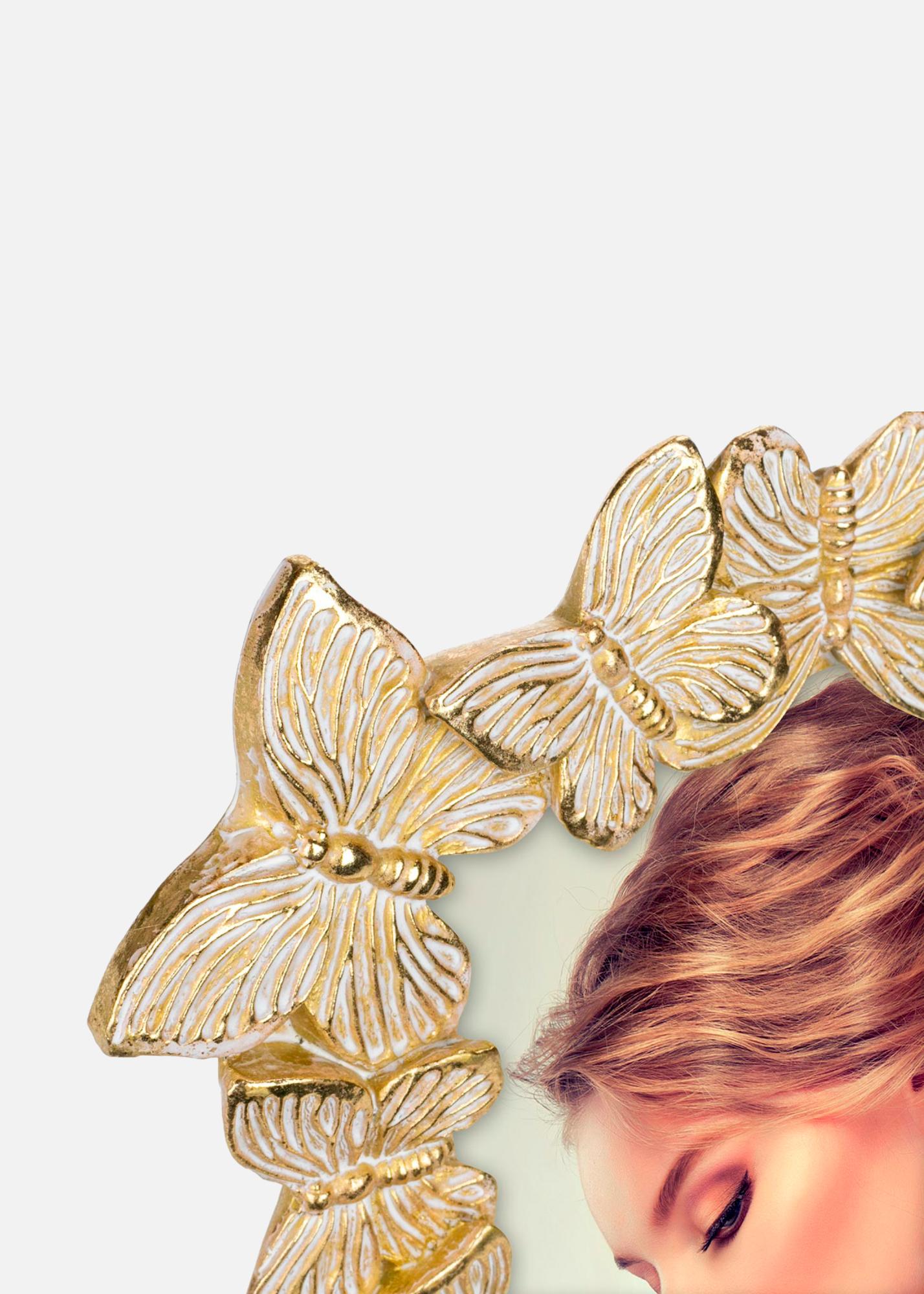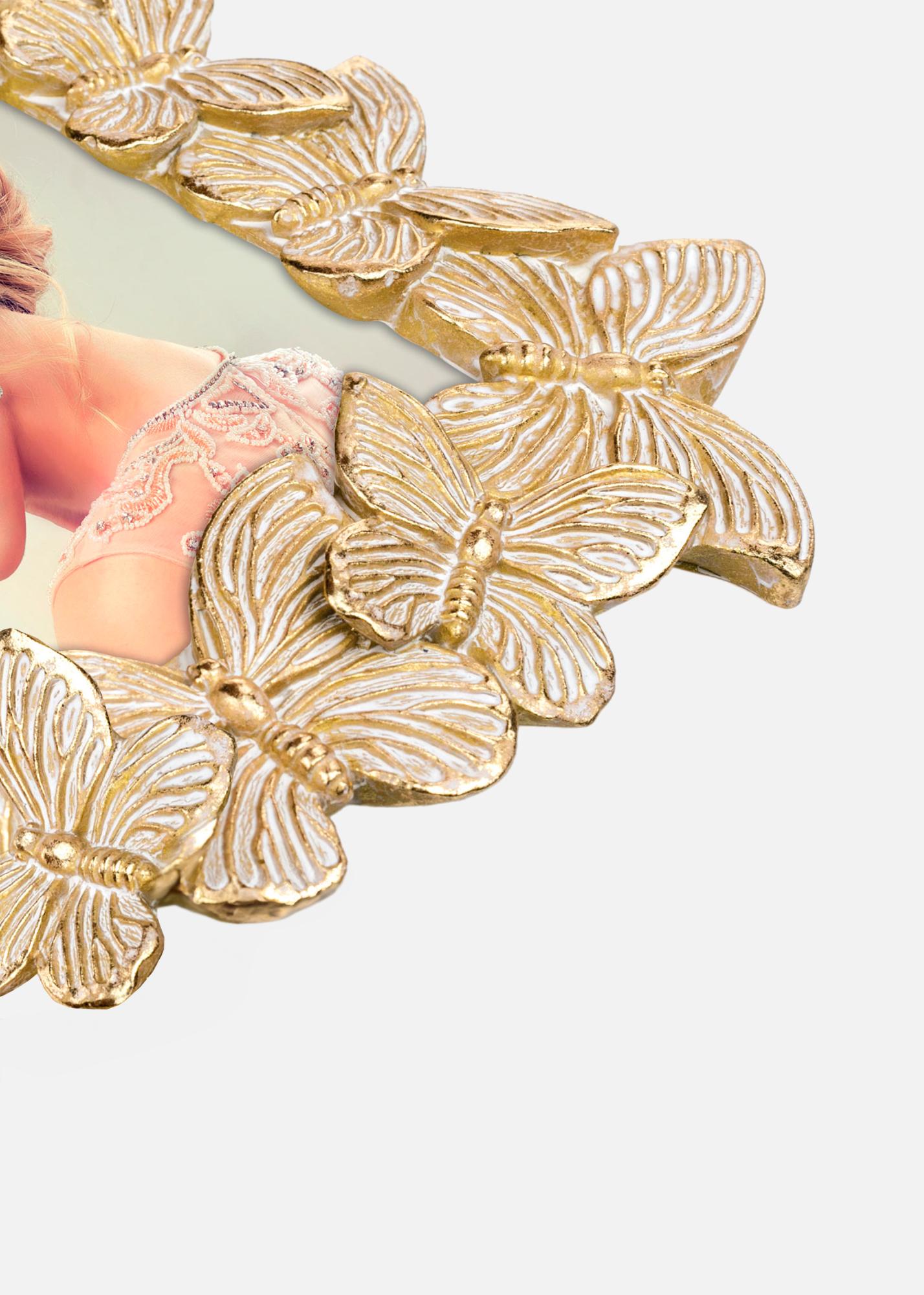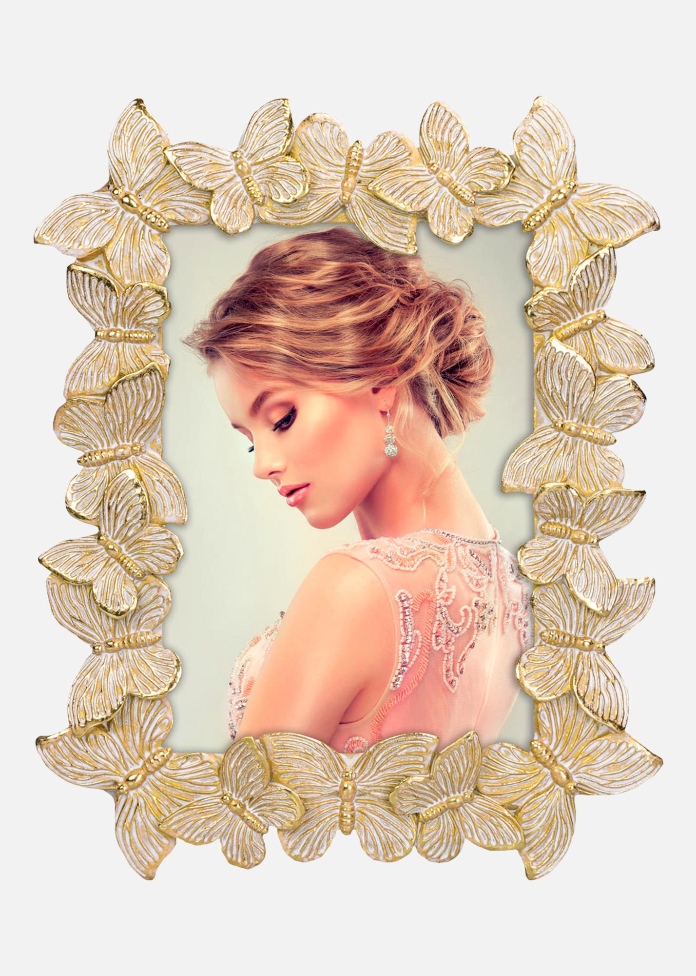 Ανακαλύψτε την μαγευτική ομορφιά της κορνίζας μας διαστάσεων 13x18 cm, ένα πραγματικό σημείο αναφοράς για το σπίτι σας. Αυτή η μοναδική κορνίζα στολίζεται με ένα προφίλ πλαισίου γεμάτο λεπτομέρειες με πεταλούδες σε χρυσό και λευκό, προσθέτοντας μια παιγνιώδη και κομψή πινελιά στις αγαπημένες σας φωτογραφίες.