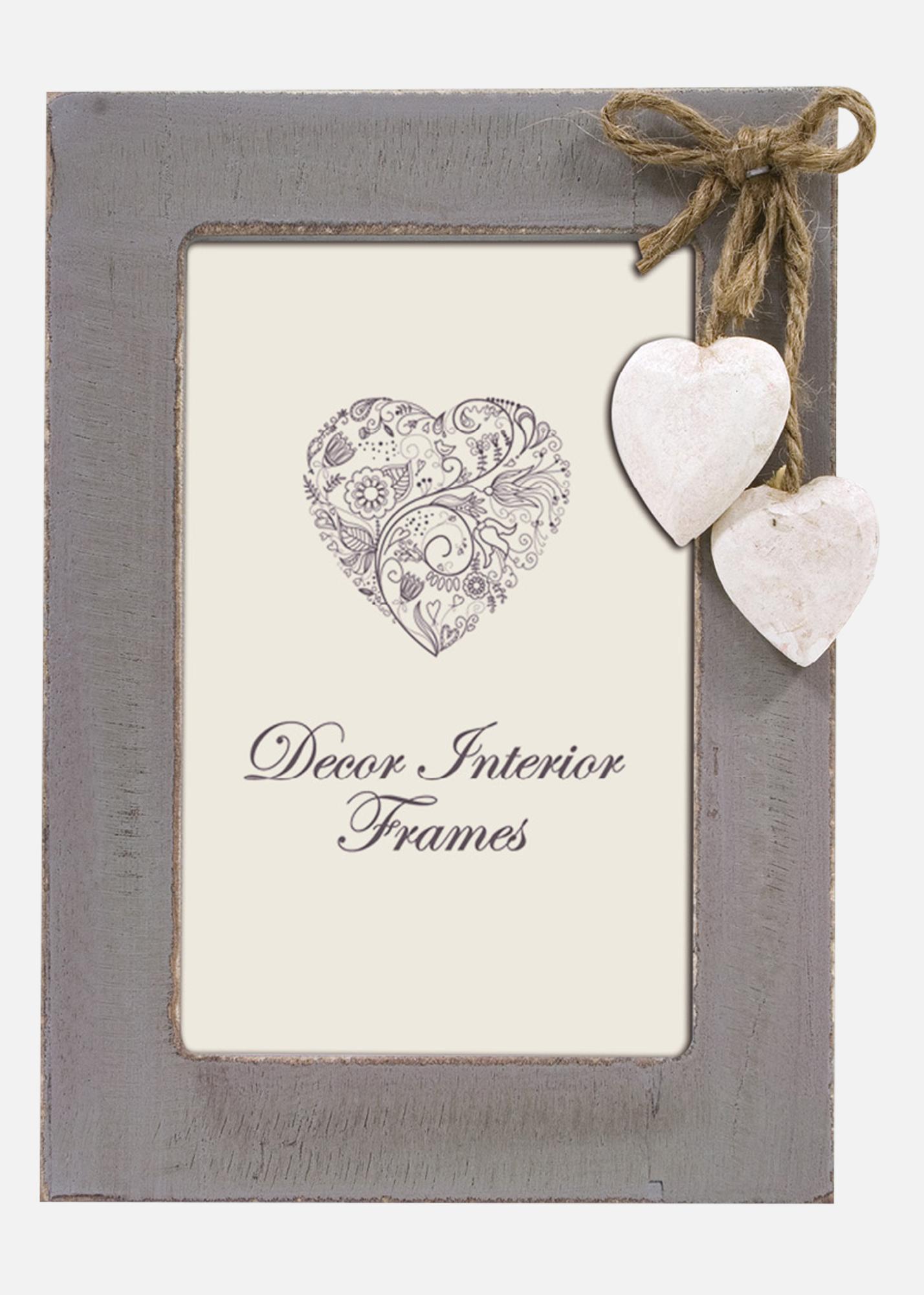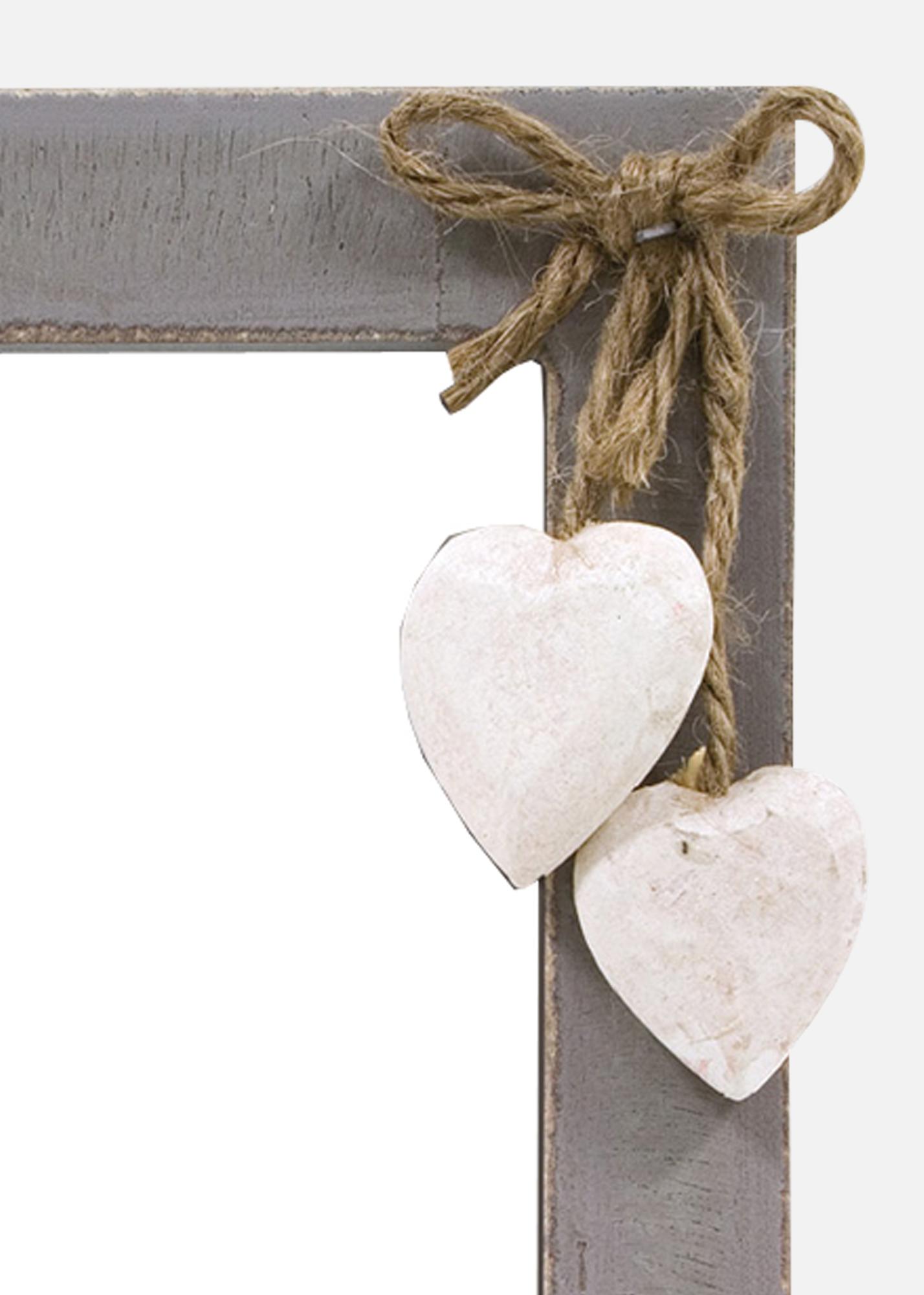 Μια γοητευτική κορνίζα με ρουστίκ αίσθηση σε ένα γκριζωπό φινίρισμα. Διακοσμημένη με δύο κρεμαστά ξύλινα καρδιές και ένα φυσικό κορδόνι για μια ρομαντική και αγροτική πινελιά. Ιδανική για να αναδείξει τις πιο αγαπημένες σας αναμνήσεις και να δημιουργήσει μια ζεστή ατμόσφαιρα στο σπίτι.