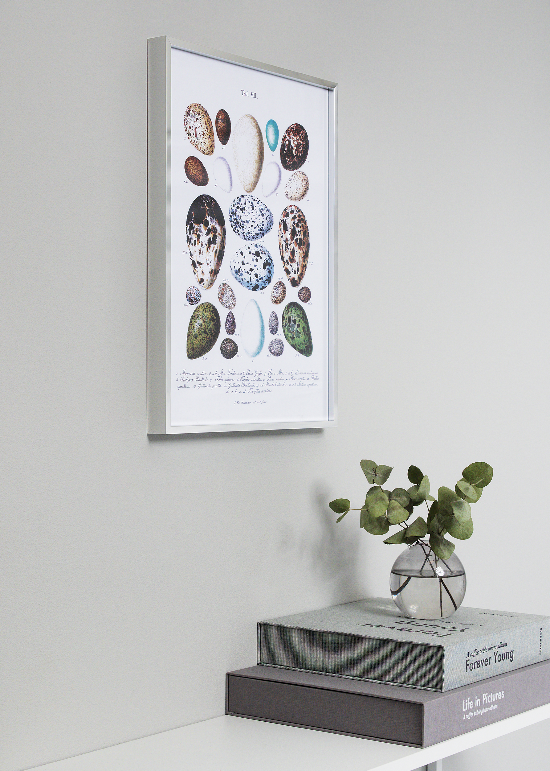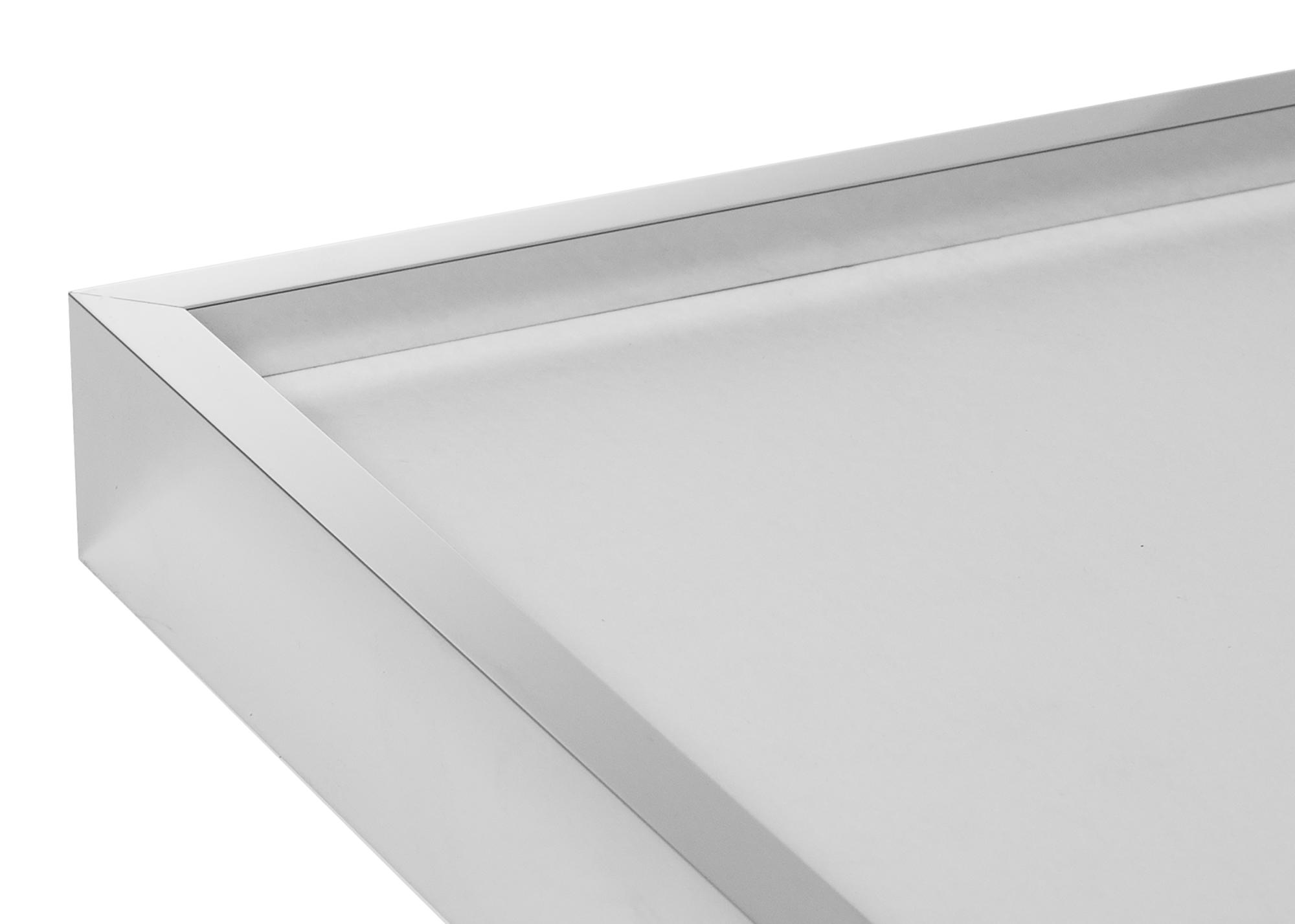 Κομψή γυαλιστερή ασημί κορνίζα υψηλής ποιότητας, κατασκευασμένη στη Γερμανία με λεπτό πλαίσιο από αλουμίνιο. Ο μινιμαλιστικός σχεδιασμός της κορνίζας την καθιστά ιδανική για σπίτια με απλό διακοσμητικό στυλ και το διακριτικό ανοιχτό γκρι ασημί χρώμα είναι εξίσου κατάλληλο για να πλαισιώνετε φωτογραφίες και αφίσες. Η μεγάλη επιλογή μεγεθών καθιστά την κορνίζα τέλεια για χρήση σε ένα κολλάζ εικόνων όπου η συλλογή των πινάκων συνδέεται μέσω της επιλογής πλαισίου.