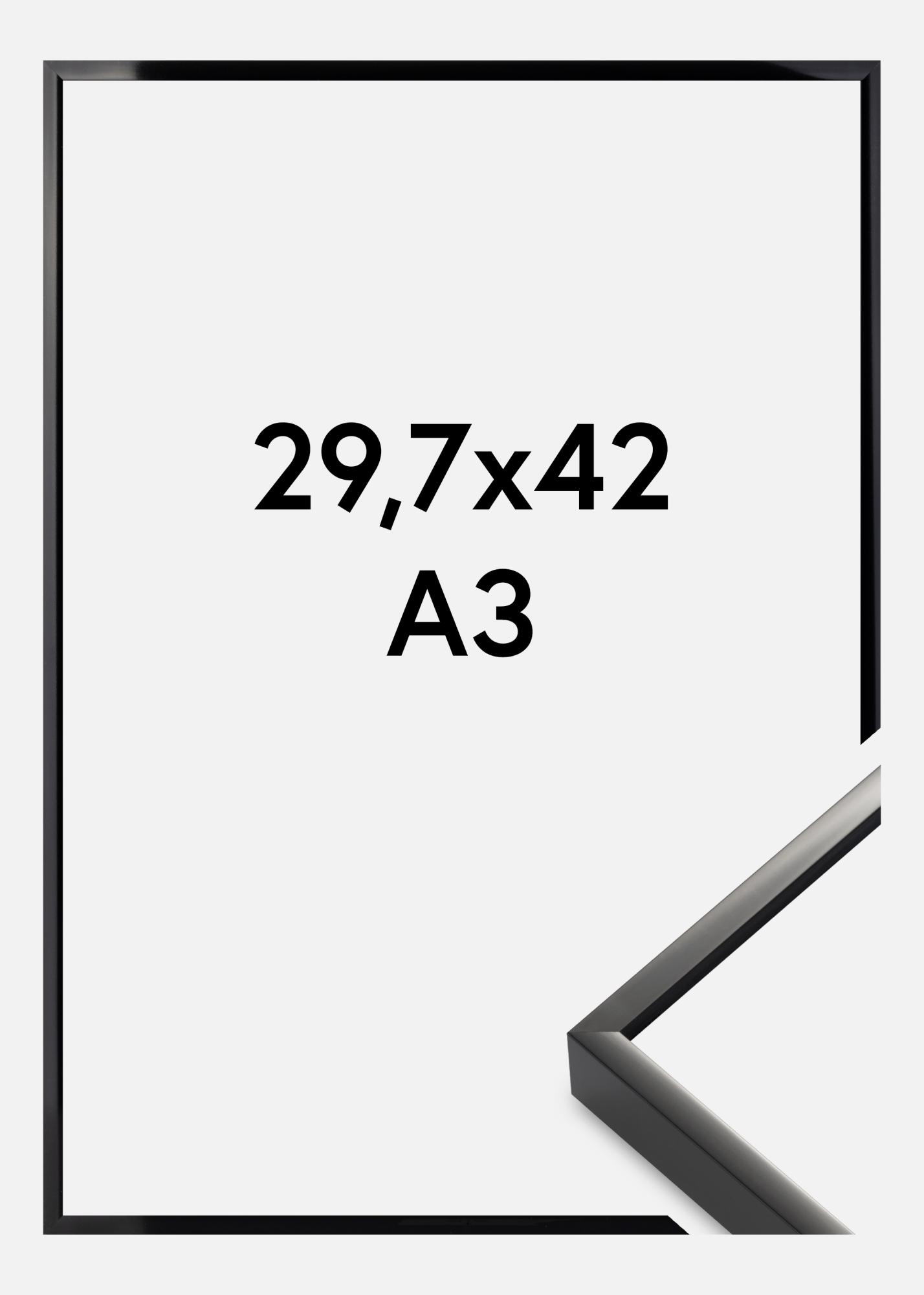 Κομψή κορνίζα premium με γυαλιστερό λεπτό μαύρο πλαίσιο που ταιριάζει απόλυτα σε ένα σύγχρονο κομψό εσωτερικό. Η επιφάνεια της κορνίζας και η μινιμαλιστική αίσθηση στον λιτό σχεδιασμό καθιστούν την ιδανική για χρήση σε γραφικά πόστερ και ασπρόμαυρες φωτογραφίες. Η κορνίζα κατασκευάζεται από αλουμίνιο και διατίθεται σε πολλές διαφορετικές διαστάσεις, κάτι που την καθιστά μια καλή επιλογή όταν θέλετε να δημιουργήσετε ένα τείχος με κάδρα διαφόρων μορφών που ενώνονται από την επιλογή κορνίζας.