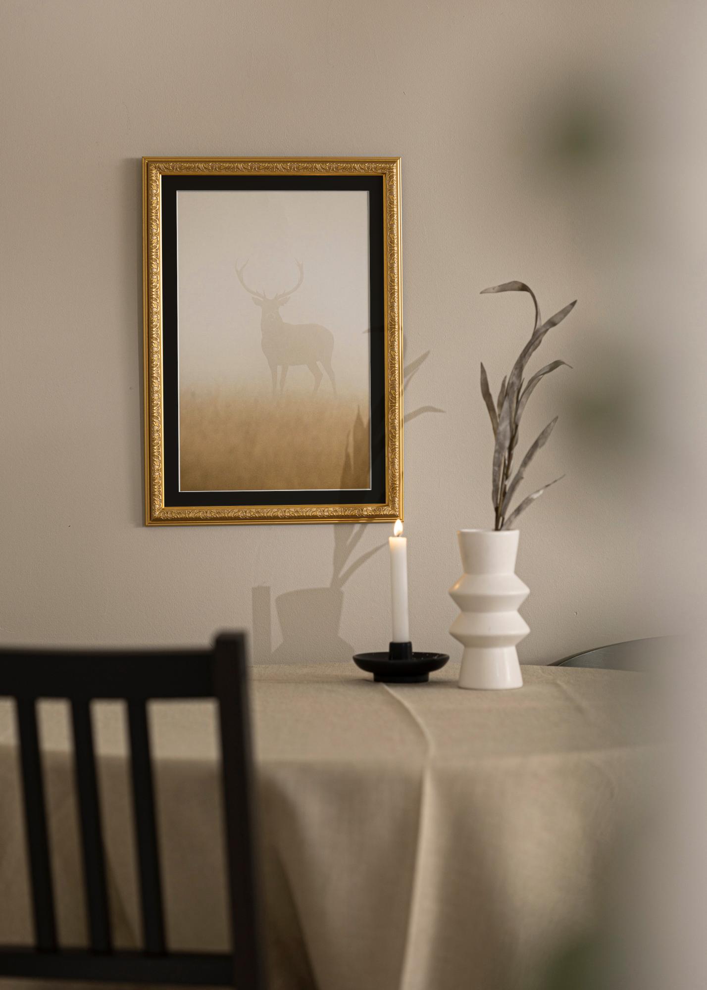 Δώστε στις αγαπημένες σας εικόνες την προσοχή που τους αξίζει με μια κομψή χρυσή κορνίζα, συμπληρωμένη με μαύρο πασπαρτού. Αυτός ο σοφιστικέ συνδυασμός αναδεικνύει την αντίθεση και το βάθος της φωτογραφίας ή έργου τέχνης σας, ενώ το μαύρο πασπαρτού δημιουργεί μια οπτική παύση που τραβάει το βλέμμα του θεατή στην εικόνα. Ο λαμπερός χρυσός τόνος της κορνίζας προσθέτει μια πολυτελή πινελιά στον εσωτερικό σας χώρο και ταιριάζει τέλεια τόσο σε κλασικά όσο και σε μοντέρνα περιβάλλοντα.
