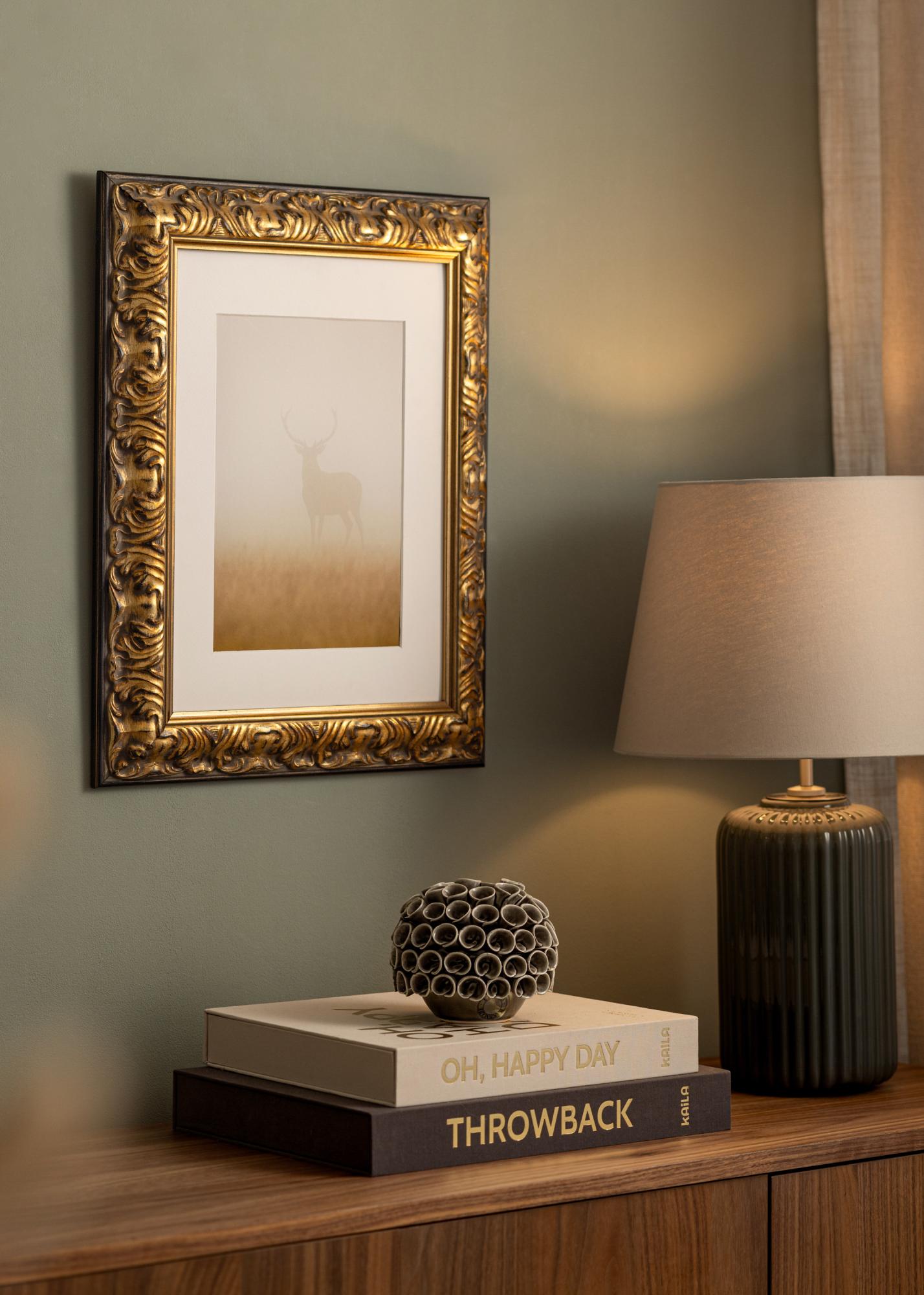 Η κατόπιν παραγγελίας κορνίζα Odin σε χρυσό και μαύρο είναι η τέλεια επιλογή για εσάς που αναζητάτε ένα κομψό και κλασικό πλαίσιο. Με τη χρυσαφένια του επιφάνεια και τις μαύρες λεπτομέρειες, αυτή η κορνίζα προσφέρει μια αντίκα αίσθηση που αναβαθμίζει κάθε έργο τέχνης ή φωτογραφία. Ο διακοσμημένος σχεδιασμός δημιουργεί μια όμορφη αντίθεση ανάμεσα στο ζεστό χρυσό και τις βαθιές μαύρες λεπτομέρειες, προσδίδοντας μια κομψή και παραδοσιακή εμφάνιση.