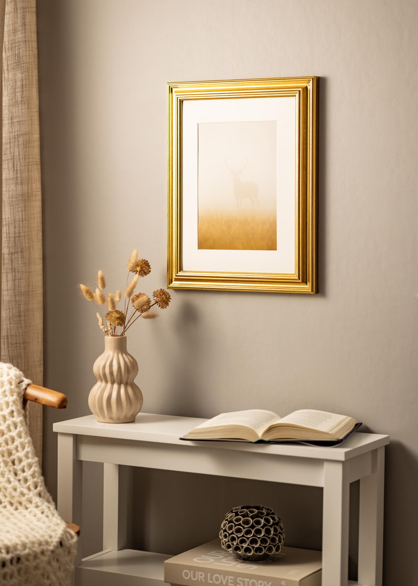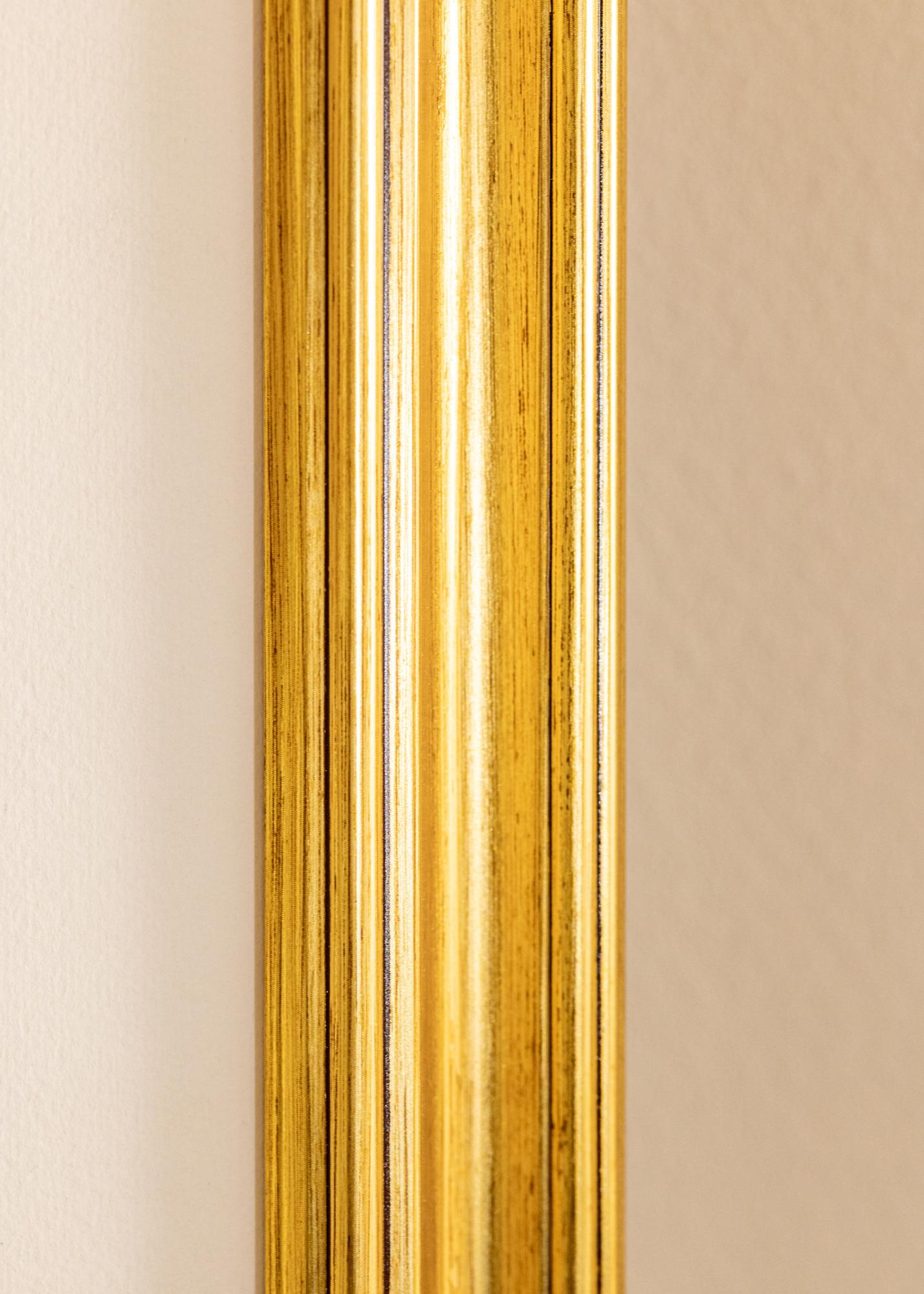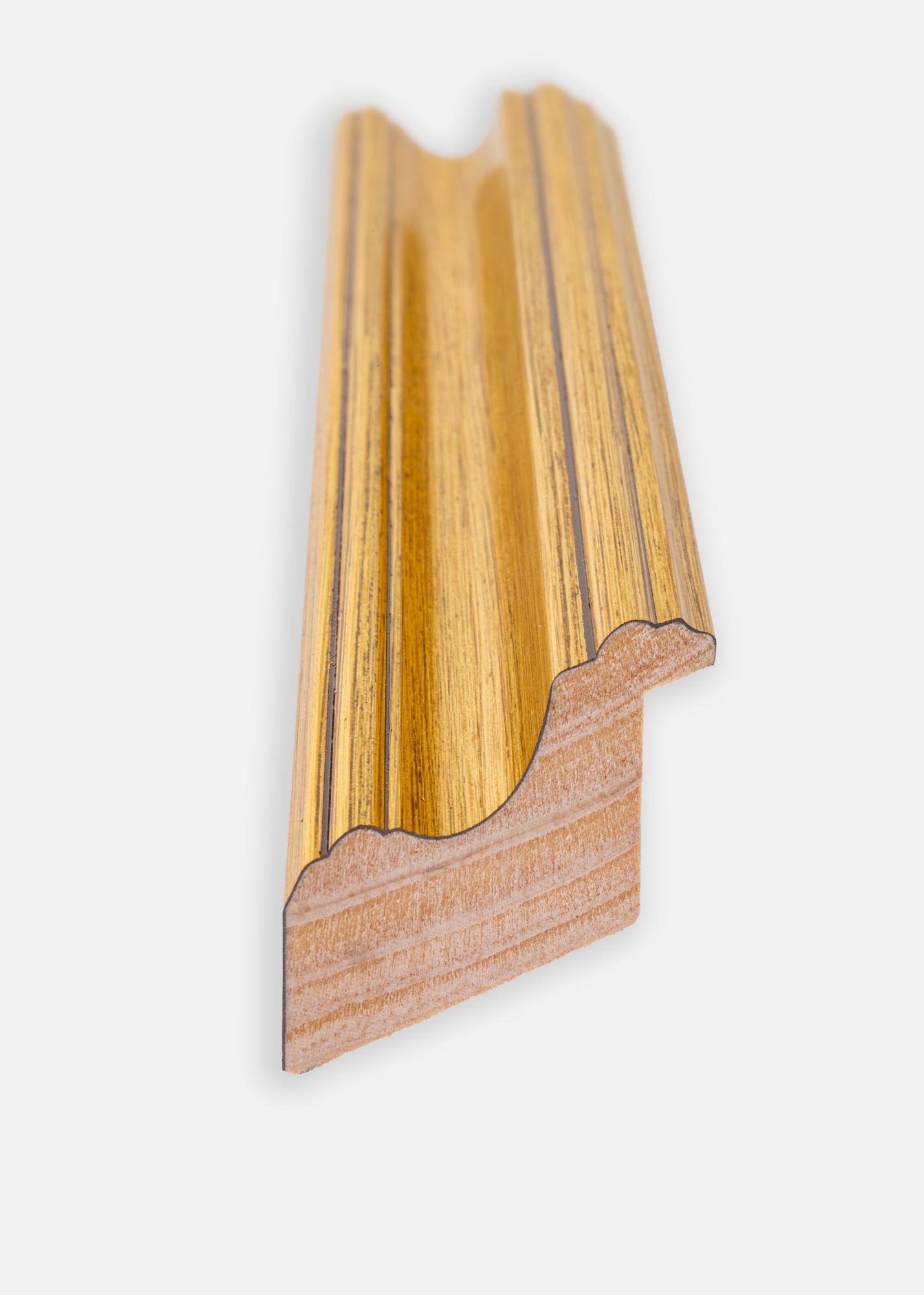 Αποκλειστική κλασικά σχεδιασμένη ξύλινη κορνίζα σε χρυσαφί χρώμα με αίσθηση χειροποίητου, που κάνει την κορνίζα να φαίνεται ζωντανή και δίνει μια ωραία λάμψη. Μια στυλιστικά σωστή κορνίζα για να κορνιζάρετε τόσο τοπιογραφίες όσο πορτραίτα και νεκρές φύσεις, ή γιατί όχι για να δημιουργήσετε μια συναρπαστική αντίθεση σε μια απλή γραφική αφίσα. Οι κορνίζες με χρυσαφί χρώμα ταιριάζουν καλά τόσο σε σπίτια με αντικέ διακόσμηση όσο και σε αστικές κατοικίες που επιθυμούν μια κομψή πινελιά. Κρεμάστε πολλούς πίνακες με διαφορετικά στυλ σε χρυσές κορνίζες μαζί για να δημιουργήσετε έναν τοίχο με πίνακες.