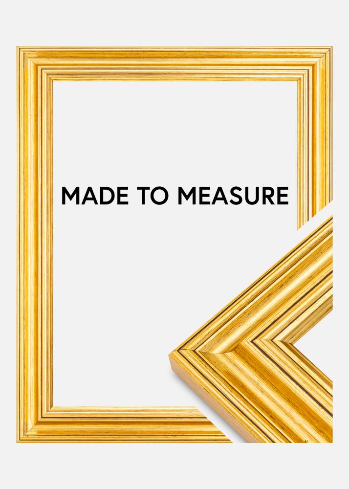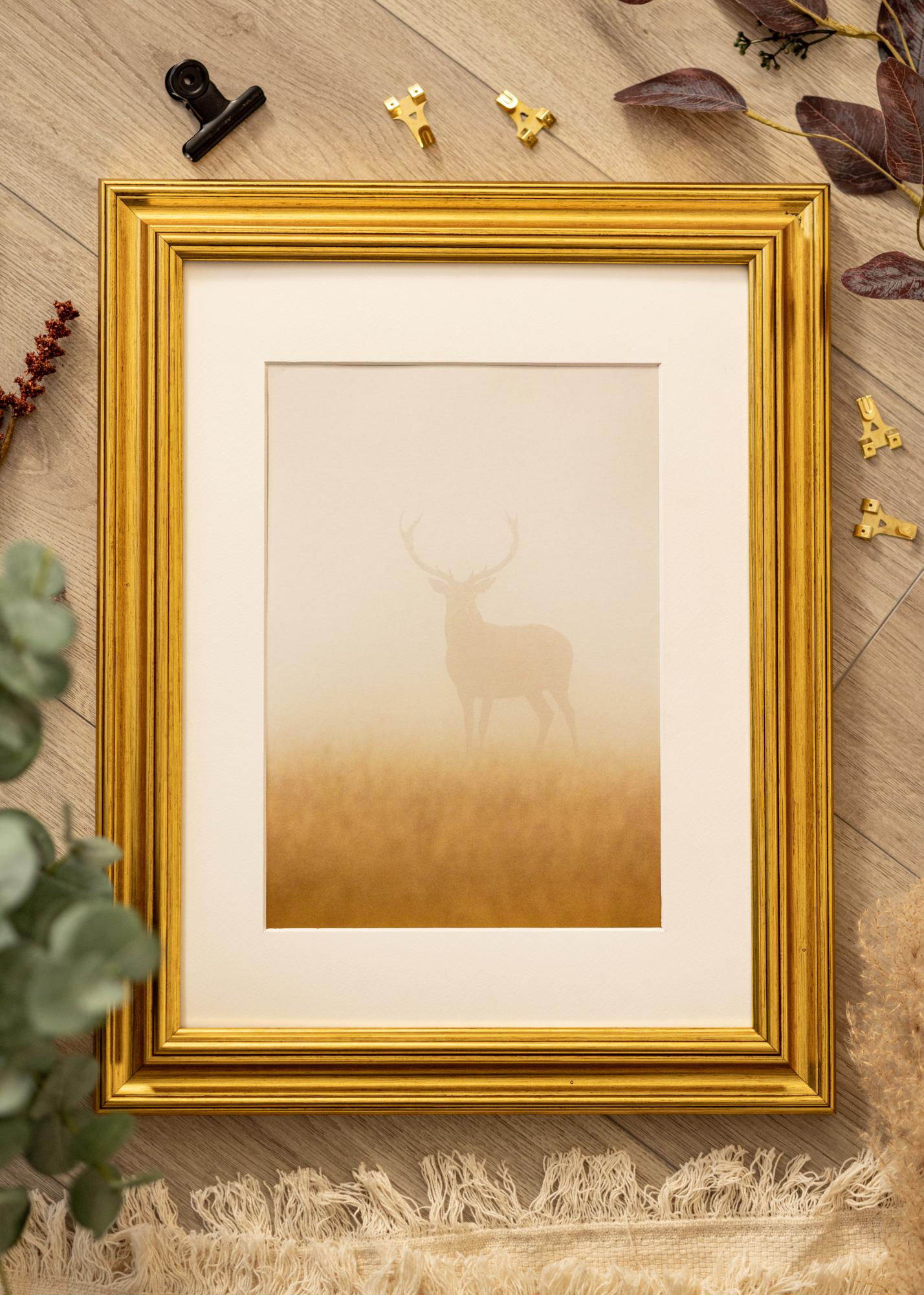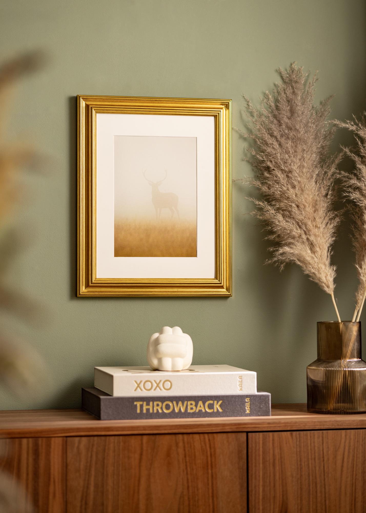 Αποκλειστική κλασικά σχεδιασμένη ξύλινη κορνίζα σε χρυσαφί χρώμα με αίσθηση χειροποίητου, που κάνει την κορνίζα να φαίνεται ζωντανή και δίνει μια ωραία λάμψη. Μια στυλιστικά σωστή κορνίζα για να κορνιζάρετε τόσο τοπιογραφίες όσο πορτραίτα και νεκρές φύσεις, ή γιατί όχι για να δημιουργήσετε μια συναρπαστική αντίθεση σε μια απλή γραφική αφίσα. Οι κορνίζες με χρυσαφί χρώμα ταιριάζουν καλά τόσο σε σπίτια με αντικέ διακόσμηση όσο και σε αστικές κατοικίες που επιθυμούν μια κομψή πινελιά. Κρεμάστε πολλούς πίνακες με διαφορετικά στυλ σε χρυσές κορνίζες μαζί για να δημιουργήσετε έναν τοίχο με πίνακες.