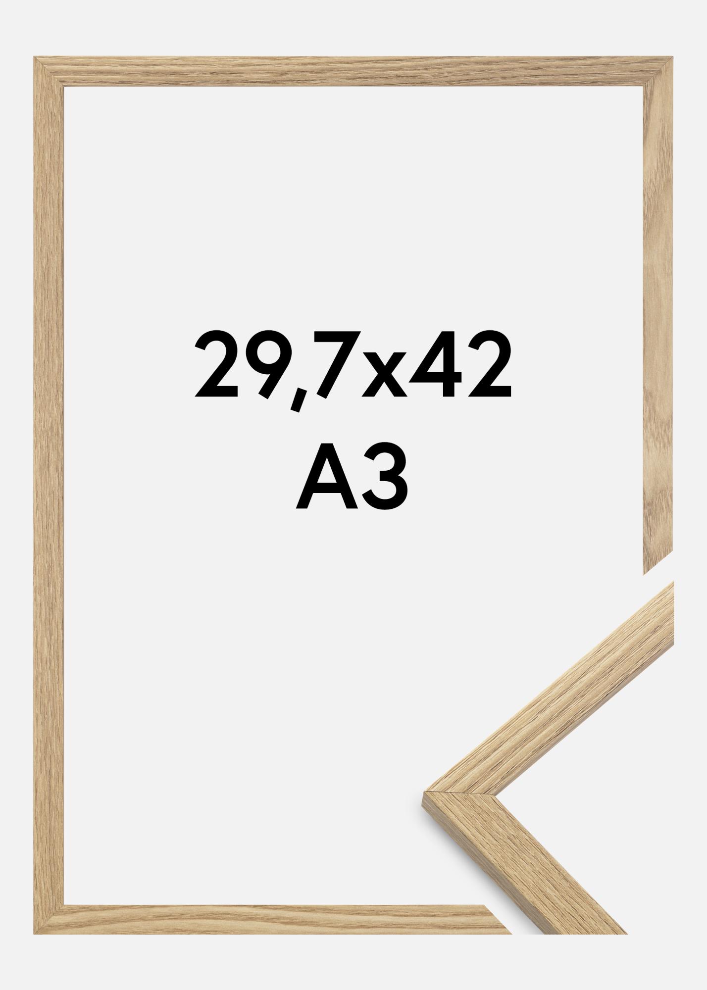 Η κορνίζα είναι κατασκευασμένη από MDF με επιφάνεια με φύλλο σε χρώμα δρυός και έχει ένα λεπτό προφίλ κορνίζας 14 mm. Υπάρχει αρκετός χώρος για να συμπληρώσετε τις εικόνες σας με ένα πολυτελές passepartout, χάρη στο εσωτερικό βάθος (βάθος λοξής) της κορνίζας που είναι 12 mm.
