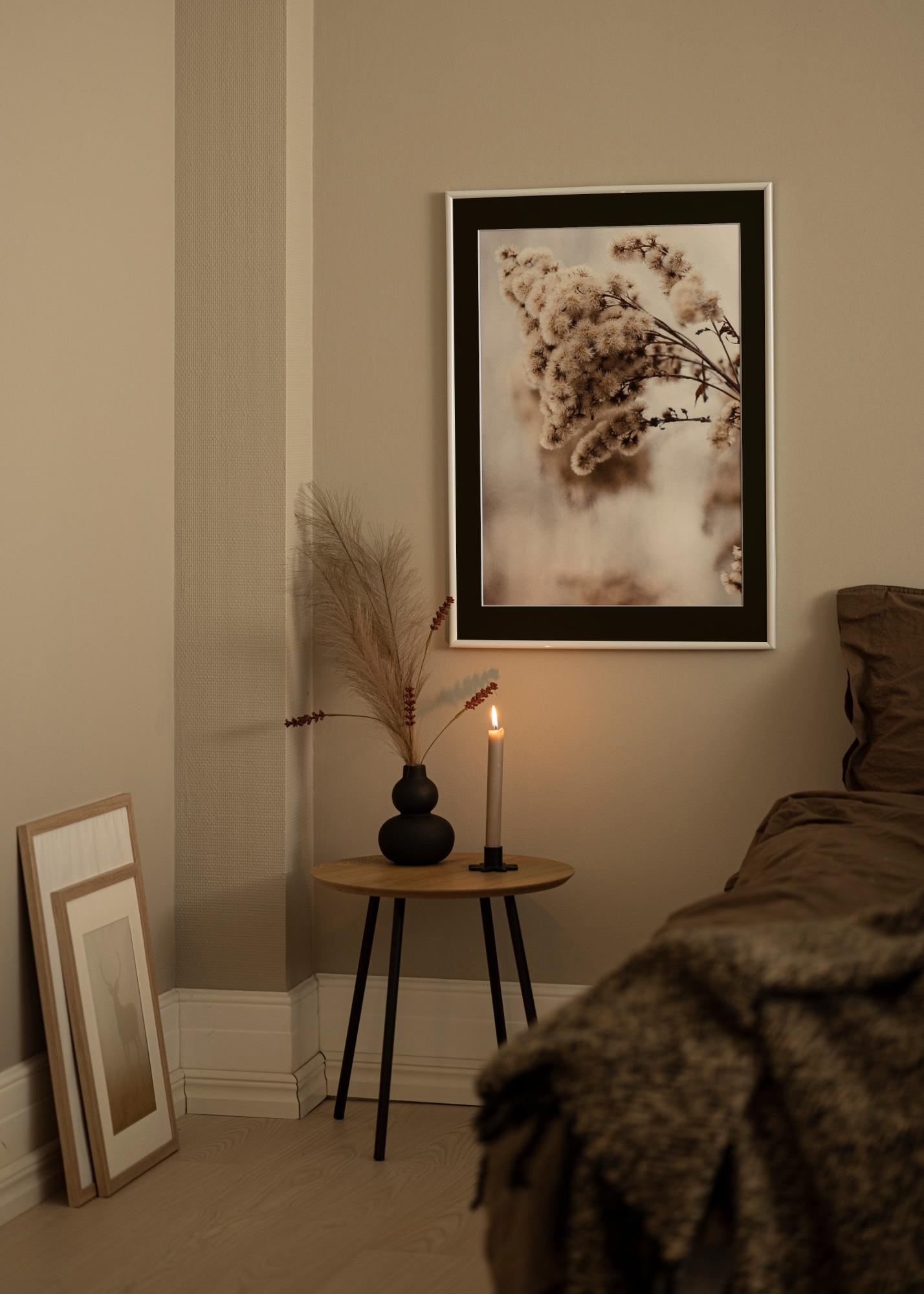 Το πλαίσιο είναι κατασκευασμένο με έναν λεπτό πλάτος μόλις 7 χιλιοστών και βάθος 14 χιλιοστών, προσφέροντας μια διακριτική αλλά διακριτική γραμμή γύρω από την εικόνα σας. Η γυαλιστερή επιφάνεια του πλαισίου συμπληρώνει το πασπαρτού και δημιουργεί μια αρμονική συνολικότητα που ταιριάζει σε κάθε δωμάτιο. Με το μαύρο πασπαρτού, επιπλέον λαμβάνετε μια επιπλέον διάσταση κομψότητας και επαγγελματικής παρουσίασης.